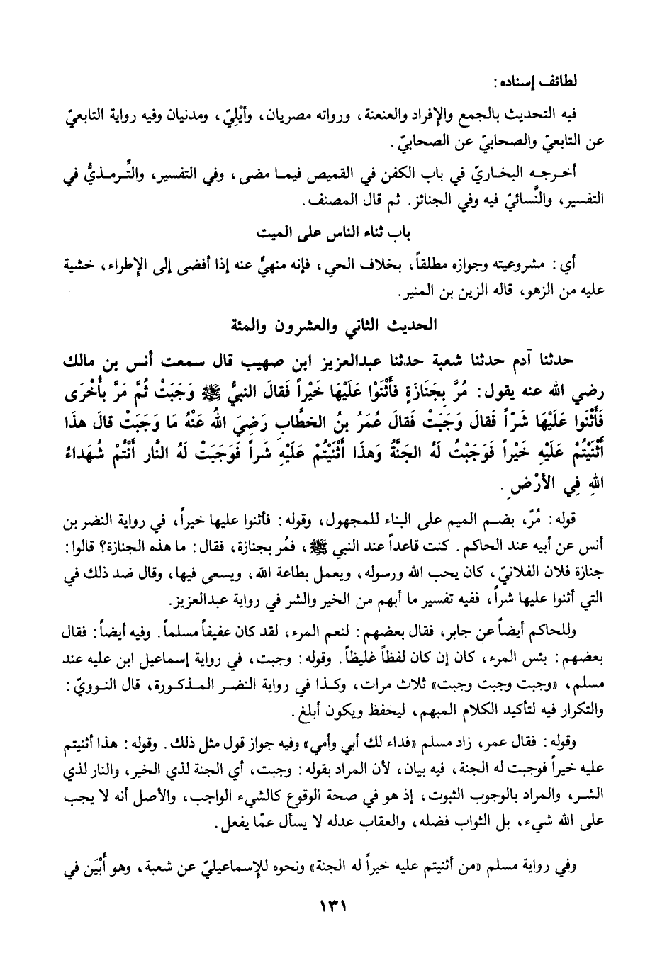 قوله: مُرّ، بضم الميم على البناء للمجهول، وقوله: فأثنوا عليها خيرًا، في رواية النضر بن أنس عن أبيه عند الحاكم. كنت قاعدًا عند النبي -صلى الله عليه وسلم-، فمُر بجنازة، فقال: ما هذه الجنازة؟ قالوا: جنازة فلان الفلانيّ، كان يحب الله ورسوله، ويعمل بطاعة الله، ويسعى فيها، وقال ضد ذلك في التي أثنوا عليها شرًا، ففيه تفسير ما أبهم من الخير والشر في رواية عبد العزيز.
