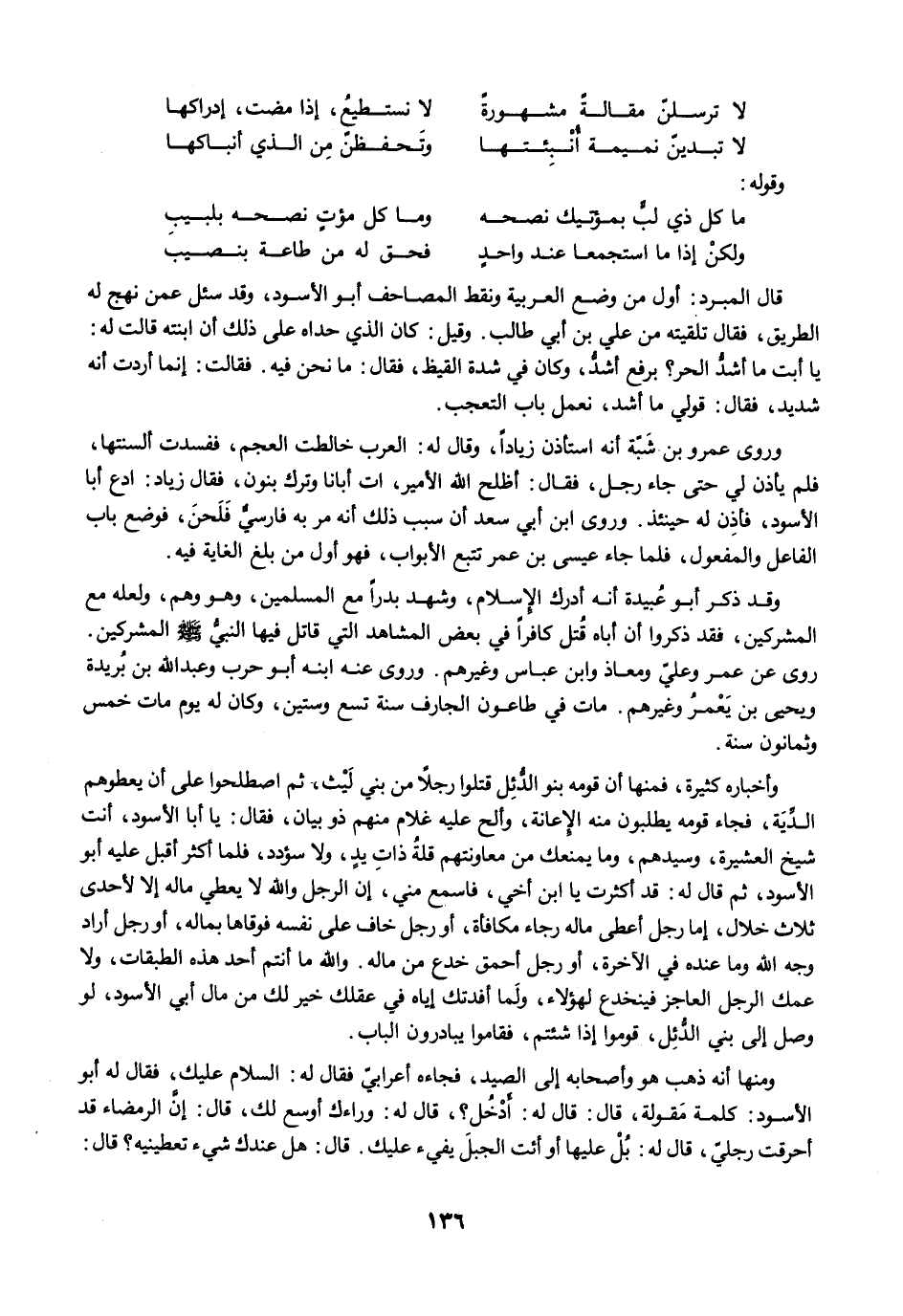 ومنها أنه ذهب هو وأصحابه إلى الصيد، فجاءه أعرابيّ فقال له: السلام عليك، فقال له أبو الأسود: كلمة مَقولة، قال: قال له: أَدْخُل؟، قال له: وراءك أوسع لك، قال: إنَّ الرمضاء قد أحرقت رجليّ، قال له: بُلْ عليها أو أئت الجبلَ يفيء عليك. قال: هل عندك شيء تعطينيه؟ قال: