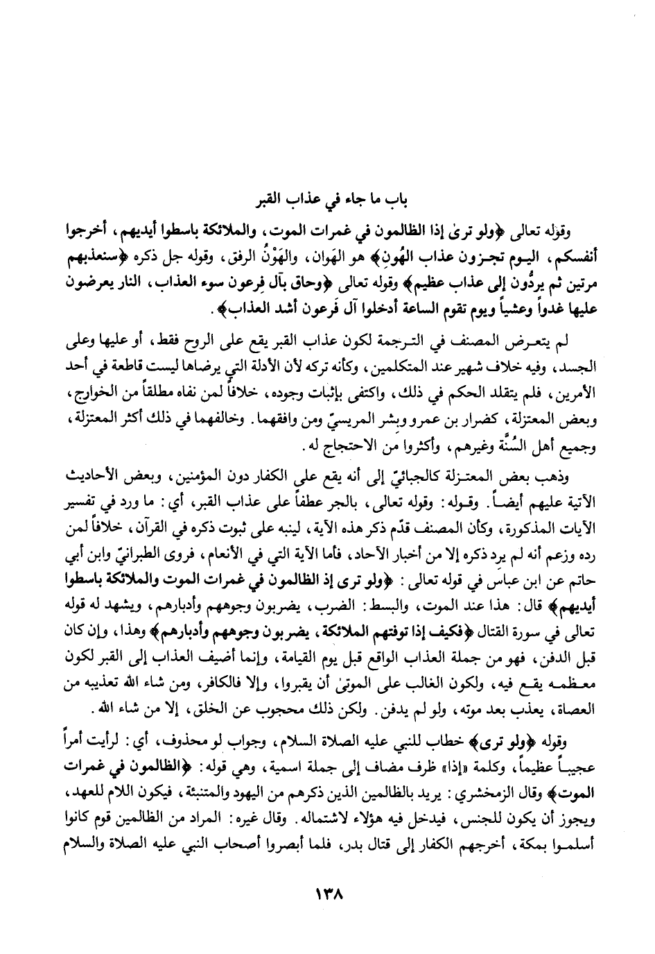 وذهب بعض المعتزلة كالجبائيّ إلى أنه يقع على الكفار دون المؤمنين، وبعض الأحاديث الآتية عليهم أيضًا. وقوله: وقوله تعالى، بالجر عطفًا على عذاب القبر، أي: ما ورد في تفسير الآيات المذكورة، وكأن المصنف قدّم ذكر هذه الآية، لينبه على ثبوت ذكره في القرآن، خلافًا لمن رده وزعم أنه لم يرِد ذكره إلا من أخبار الآحاد، فأما الآية التي في الأنعام، فروى الطبرانيّ وابن أبي حاتم عن ابن عباس في قوله تعالى: {وَلَوْ تَرَى إِذِ الظَّالِمُونَ فِي غَمَرَاتِ الْمَوْتِ وَالْمَلَائِكَةُ بَاسِطُو أَيْدِيهِمْ} قال: هذا عند الموت، والبسط: الضرب، يضربون وجوههم وأدبارهم، ويشهد له قوله تعالى في سورة القتال {فَكَيْفَ إِذَا تَوَفَّتْهُمُ الْمَلَائِكَةُ يَضْرِبُونَ وُجُوهَهُمْ وَأَدْبَارَهُمْ} وهذا، وإن كان قبل الدفن، فهو من جملة العذاب الواقع قبل يوم القيامة، وإنما أضيف العذاب إلى القبر لكون معظمه يقع فيه، ولكون الغالب على الموتى أن يقبروا، وإلا فالكافر، ومن شاء الله تعذيبه من العصاة، يعذب بعد موته، ولو لم يدفن. ولكن ذلك محجوب عن الخلق، إلا من شاء الله.