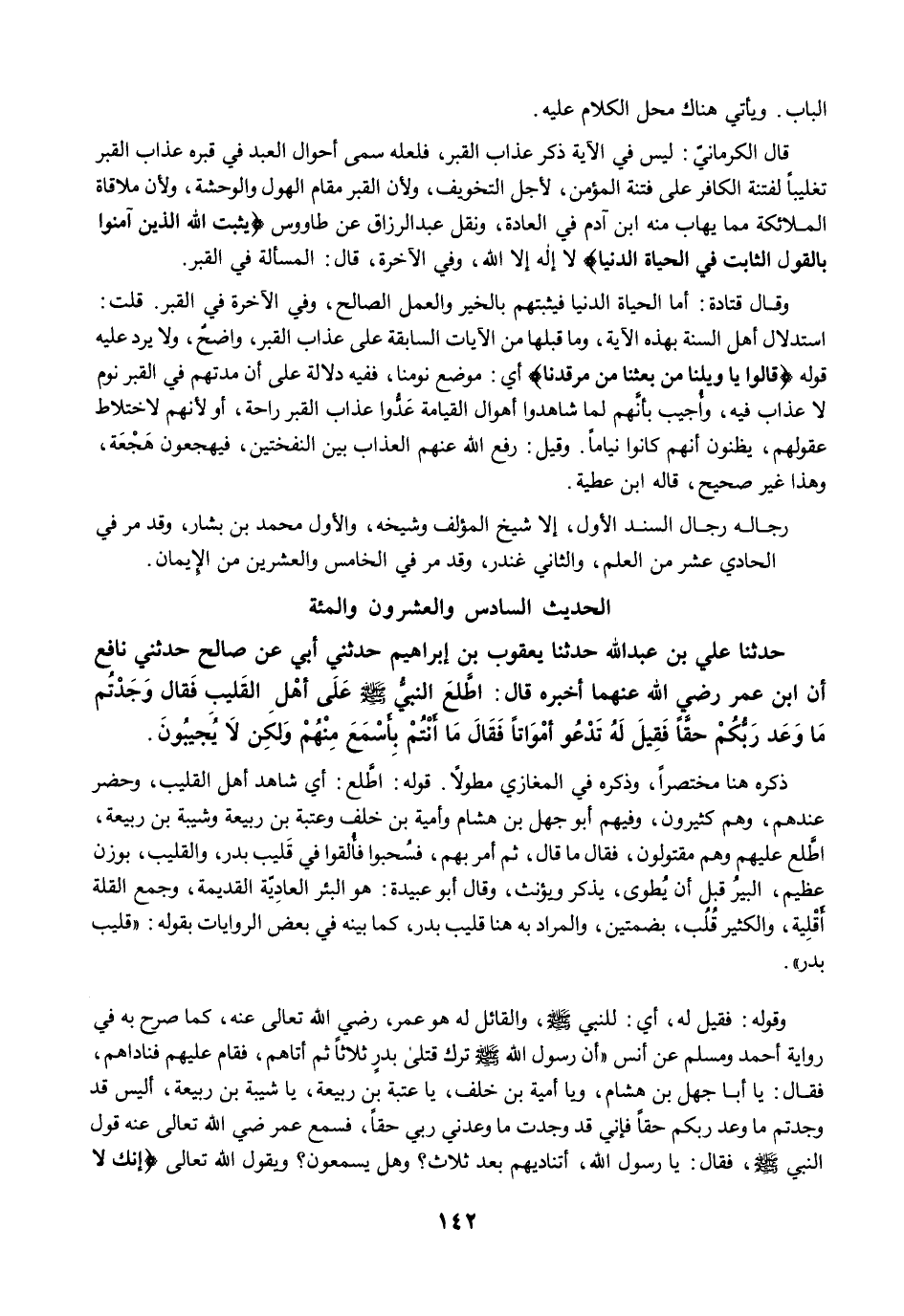 قال الكرمانيّ: ليس في الآية ذكر عذاب القبر، فلعله سمى أحوال العبد في قبره عذاب القبر تغليبًا لفتنة الكافر على فتنة المؤمن، لأجل التخويف، ولأن القبر مقام الهول والوحشة، ولأن ملاقاة الملائكة مما يهاب منه ابن آدم في العادة، ونقل عبد الرزاق عن طاووس {يُثَبِّتُ اللَّهُ الَّذِينَ آمَنُوا بِالْقَوْلِ الثَّابِتِ فِي الْحَيَاةِ الدُّنْيَا} لا إله إلا الله، وفي الآخرة، قال: المسألة في القبر.