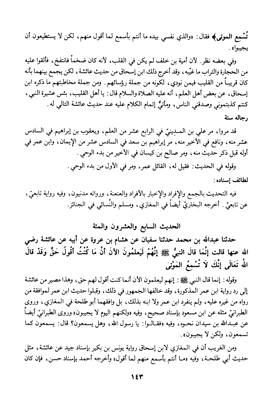 حَدَّثَنَا عَبْدُ اللَّهِ بْنُ مُحَمَّدٍ حَدَّثَنَا سُفْيَانُ عَنْ هِشَامِ بْنِ عُرْوَةَ عَنْ أَبِيهِ عَنْ عَائِشَةَ رضي الله عنها قَالَتْ إِنَّمَا قَالَ النَّبِيُّ -صلى الله عليه وسلم- إِنَّهُمْ لَيَعْلَمُونَ الآنَ أَنَّ مَا كُنْتُ أَقُولُ حَقٌّ وَقَدْ قَالَ اللَّهُ تَعَالَى {إِنَّكَ لَا تُسْمِعُ الْمَوْتَى}.