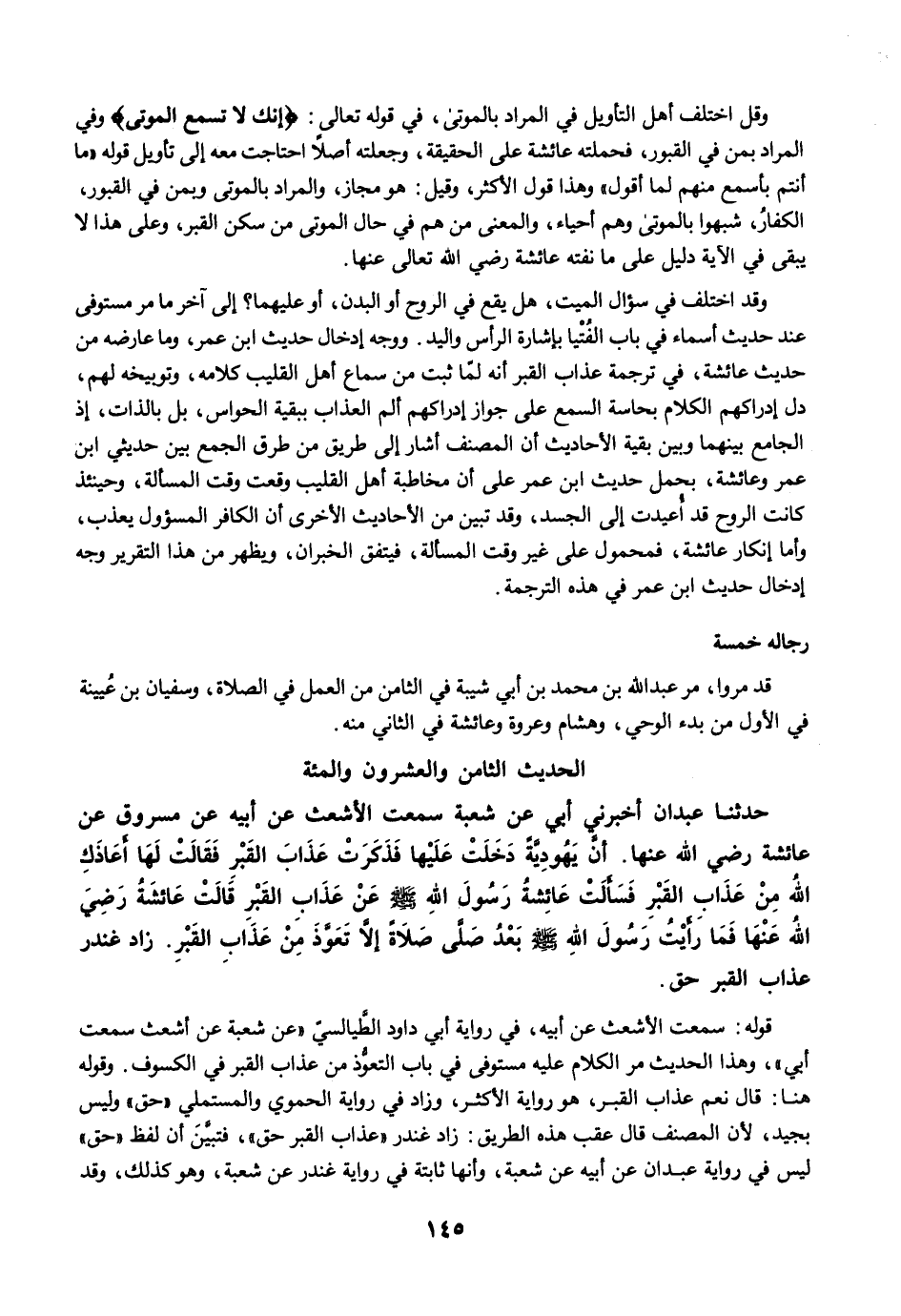 وقل اختلف أهل التأويل في المراد بالموتى، في قوله تعالى: {إِنَّكَ لَا تُسْمِعُ الْمَوْتَى} وفي المراد بمن في القبور، فحملته عائشة على الحقيقة، وجعلته أصلًا احتاجت معه إلى تأويل قوله "ما أنتم بأسمع منهم لما أقول" وهذا قول الأكثر، وقيل: هو مجاز، والمراد بالموتى وبمن في القبور، الكفارُ، شبهوا بالموتى وهم أحياء، والمعنى من هم في حال الموتى من سكن القبر، وعلى هذا لا يبقى في الآية دليل على ما نفته عائشة رضي الله تعالى عنها.