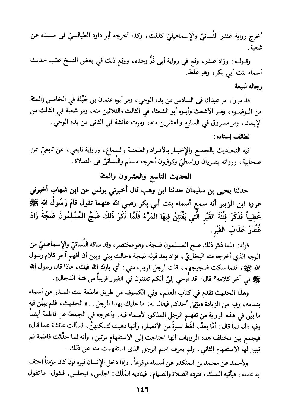 وهذا الحديث تقدم في كتاب العلم، وفي الكسوف من طريق فاطمة بنت المنذر عن أسماء بتمامه، وفيه من الزيادة "يؤتى أحدكم فيقال له: ما عليك بهذا الرجل .. " الحديث، فلم يبيِّن فيه ما بيَّن في هذه الرواية من تفهيم الرجل المذكور لأسماء فيه. وأخرجه في الجمعة عن فاطمة أيضًا وفيه "أنه لما قال: أمَّا بعدُ، لَغَط نسوةٌ من الأنصار، وأنها ذهبت لتسكتهنَّ، فسألت عائشة عما قال" فيجمع بين مختلف هذه الروايات أنها احتاجت إلى الاستفهام مرتين، وأنه لما حدَّثت فاطمة لم تبين لها الاستفهام الثاني، ولم يعرف اسم الرجل الذي استفهمت منه عن ذلك.
