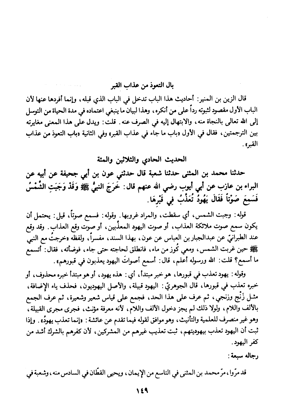 حَدَّثَنَا مُحَمَّدُ بْنُ الْمُثَنَّى حَدَّثَنَا شُعْبَةُ قَالَ حَدَّثَنِي عَوْنُ بْنُ أَبِي جُحَيْفَةَ عَنْ أَبِيهِ عَنِ الْبَرَاءِ بْنِ عَازِبٍ عَنْ أَبِي أَيُّوبَ رضي الله عنهم قَالَ: خَرَجَ النَّبِيُّ -صلى الله عليه وسلم- وَقَدْ وَجَبَتِ الشَّمْسُ، فَسَمِعَ صَوْتًا فَقَالَ يَهُودُ تُعَذَّبُ فِي قُبُورِهَا.