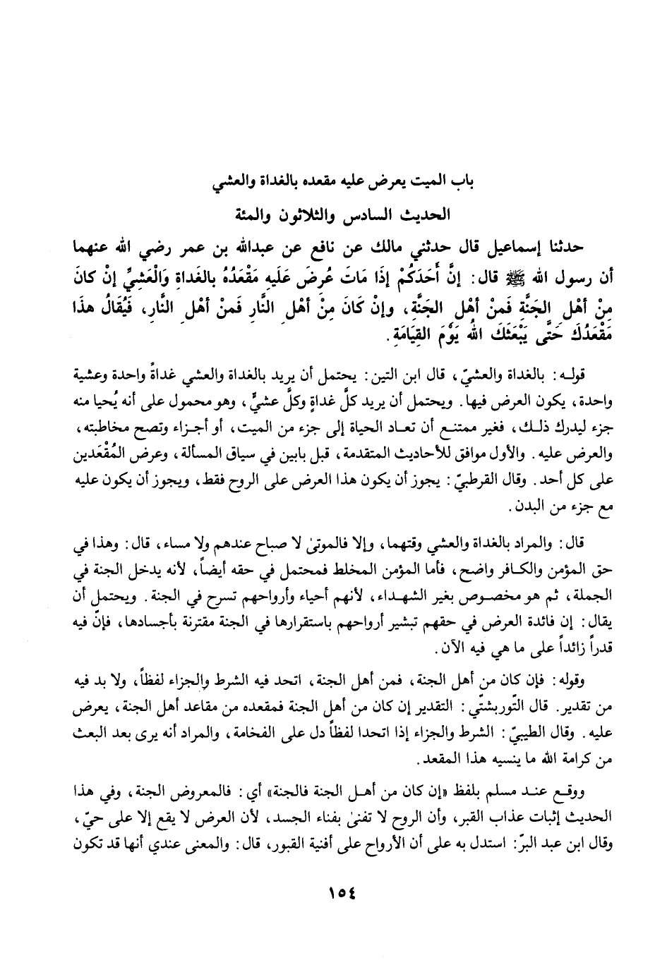 قوله: بالغداة والعشيّ، قال ابن التين: يحتمل أن يريد بالغداة والعشي غداةً واحدة وعشية واحدة، يكون العرض فيها. ويحتمل أن يريد كلَّ غداةٍ وكلَّ عشيٍّ، وهو محمول على أنه يُحيا منه جزء ليدرك ذلك، فغير ممتنع أن تعاد الحياة إلى جزء من الميت، أو أجزاء وتصح مخاطبته، والعرض عليه. والأول موافق للأحاديث المتقدمة، قبل بابين في سياق المسألة، وعرض المُقْعَدين على كل أحد. وقال القرطبي: يجوز أن يكون هذا العرض على الروح فقط، ويجوز أن يكون عليه مع جزء من البدن.