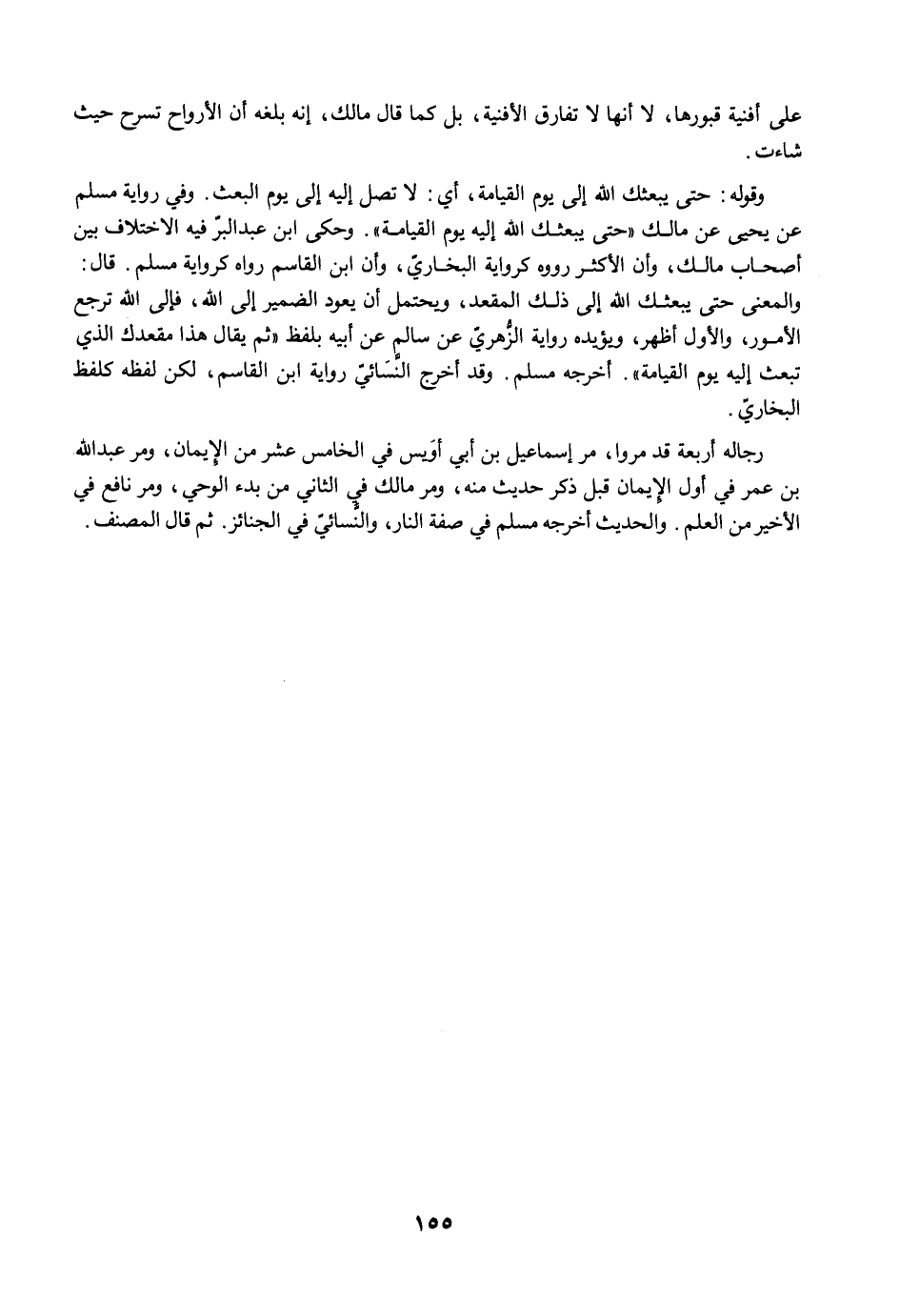 وقوله: حتى يبعثك الله إلى يوم القيامة، أي: لا تصل إليه إلى يوم البعث. وفي رواية مسلم عن يحيى عن مالك "حتى يبعثك الله إليه يوم القيامة". وحكى ابن عبد البر فيه الاختلاف بين أصحاب مالك، وأن الأكثر رووه كرواية البخاري، وأن ابن القاسم رواه كرواية مسلم. قال: والمعنى حتى يبعثك الله إلى ذلك المقعد، ويحتمل أن يعود الضمير إلى الله، فإلى الله ترجع الأمور، والأول أظهر، ويؤيده رواية الزُّهريّ عن سالم عن أبيه بلفظ "ثم يقال هذا مقعدك الذي تبعث إليه يوم القيامة". أخرجه مسلم. وقد أخرج النَّسَائيّ رواية ابن القاسم، لكن لفظه كلفظ البخاري.