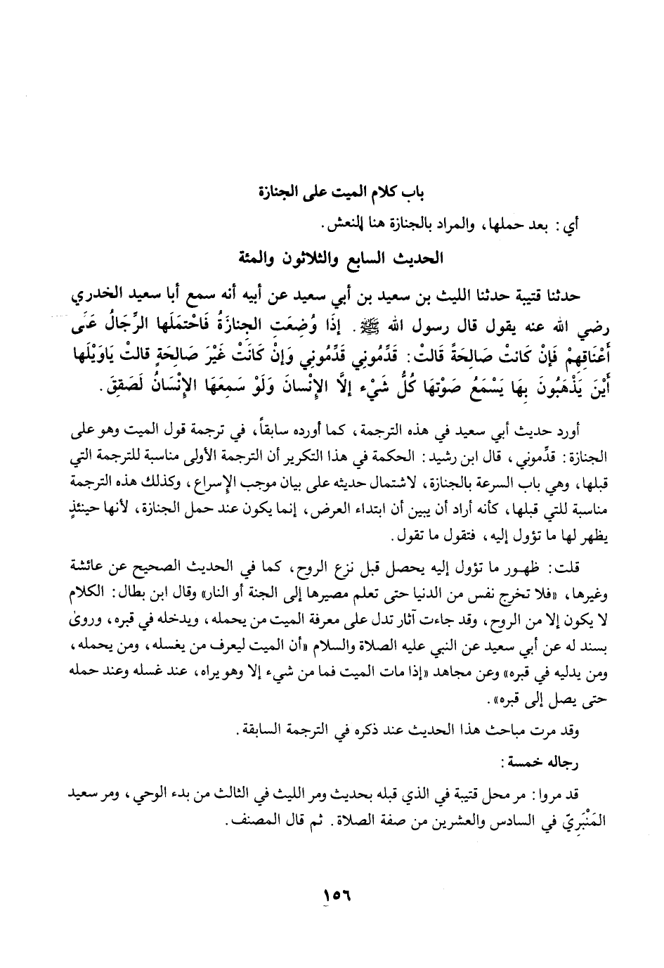 حَدَّثَنَا قُتَيْبَةُ حَدَّثَنَا اللَّيْثُ عَنْ سَعِيدِ بْنِ أَبِي سَعِيدٍ عَنْ أَبِيهِ أَنَّهُ سَمِعَ أَبَا سَعِيدٍ الْخُدْرِيَّ رضي الله عنه يَقُولُ قَالَ رَسُولُ اللَّهِ -صلى الله عليه وسلم-: إِذَا وُضِعَتِ الْجَنَازَةُ فَاحْتَمَلَهَا الرِّجَالُ عَلَى أَعْنَاقِهِمْ، فَإِنْ كَانَتْ صَالِحَةً قَالَتْ: قَدِّمُونِي قَدِّمُونِي. وَإِنْ كَانَتْ غَيْرَ صَالِحَةٍ قَالَتْ يَا وَيْلَهَا أَيْنَ يَذْهَبُونَ بِهَا. يَسْمَعُ صَوْتَهَا كُلُّ شَيْءٍ إِلاَّ الإِنْسَانَ، وَلَوْ سَمِعَهَا الإِنْسَانُ لَصَعِقَ.