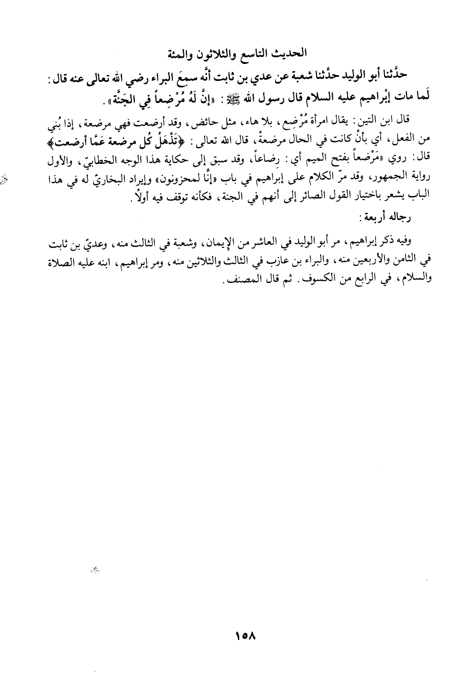 وفيه ذكر إبراهيم، مرَّ أبو الوليد في العاشر من الإيمان، وشعبة في الثالث منه، وعدي بن ثابت في الثامن والأربعين منه، والبراء بن عازب في الثالث والثلاثين منه، ومرَّ إبراهيم، ابنه عليه الصلاة والسلام، في الرابع من الكسوف. ثم قال المصنف: