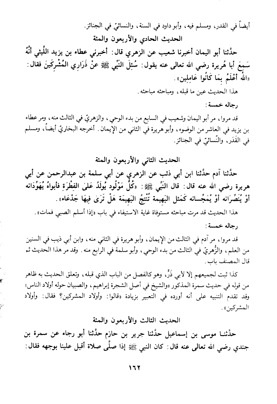حَدَّثَنَا آدَمُ حَدَّثَنَا ابْنُ أَبِي ذِئْبٍ عَنِ الزُّهْرِيِّ عَنْ أَبِي سَلَمَةَ بْنِ عَبْدِ الرَّحْمَنِ عَنْ أَبِي هُرَيْرَةَ رضي الله عنه قَالَ: قَالَ النَّبِيُّ -صلى الله عليه وسلم-: "كُلُّ مَوْلُودٍ يُولَدُ عَلَى الْفِطْرَةِ، فَأَبَوَاهُ يُهَوِّدَانِهِ أَوْ يُنَصِّرَانِهِ أَوْ يُمَجِّسَانِهِ، كَمَثَلِ الْبَهِيمَةِ تُنْتَجُ الْبَهِيمَةَ، هَلْ تَرَى فِيهَا جَدْعَاءَ".