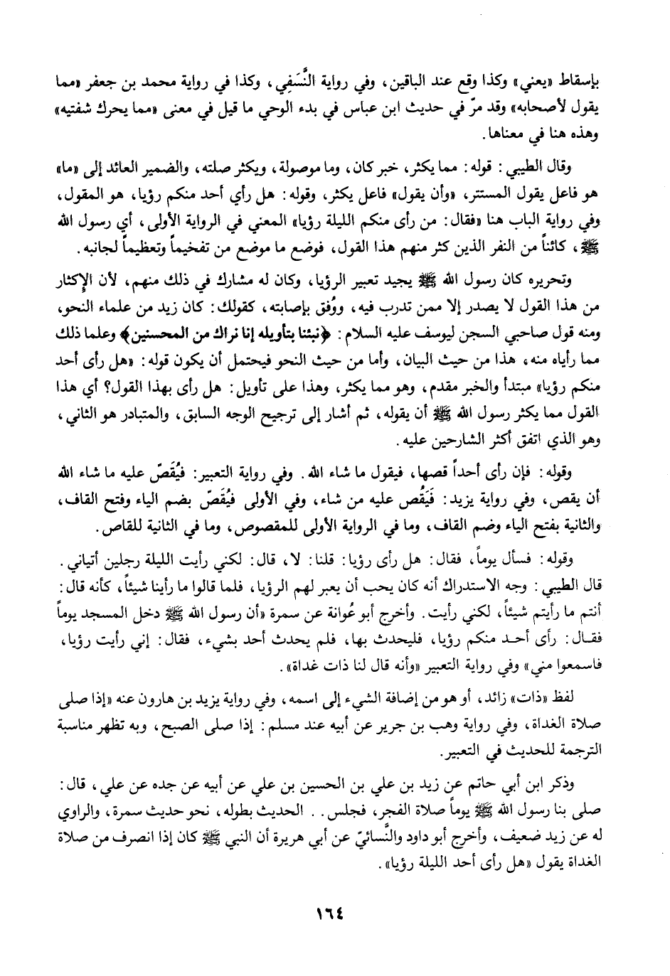 وقال الطيبي: قوله: مما يكثر، خبر كان، وما موصولة، ويكثر صلته، والضمير العائد إلى "ما" هو فاعل يقول المستتر، "وأن يقول" فاعل يكثر، وقوله: هل رأي أحد منكم رؤيا، هو المقول، وفي رواية الباب هنا "فقال: من رأى عنكم الليلة رؤيا" المعني في الرواية الأولى، أي رسول الله -صلى الله عليه وسلم-، كائنًا من النفر الذين كثر منهم هذا القول، فوضع ما موضع من تفخيماً وتعظيمًا لجانبه.