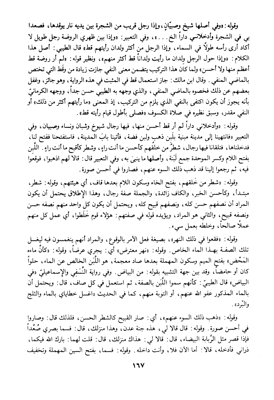 وقوله: "وفي أصلها شيخ وصبيّانٍ، وإذا رجل قريب من الشجرة بين يديه نار يوقدها، فصعدا بي في الشجرة وأدخلاني دارًا الخ ... "، وفي التعبير: "وإذا بين ظهري الروضة رجل طويل لا أكاد أرى رأسه طولًا في السماء، وإذا الرجل من أكثر ولدان رأيتهم قط" قال الطيبي: أصل هذا الكلام: "وإذا حول الرجل وِلدان ما رأيت ولدانًا قط أكثر منهم"، ونظير قوله: "لم أر روضة قط أعظم منها ولا أحسن" ولما كان هذا التركيب يتضمن معنى النفي جازت زيادة من وقَط التي تختص بالماضي المنفي. وقال ابن مالك: جاز استعمال قط في المثبت في هذه الرواية، وهو جائز، وغفل بعضهم عن ذلك فخصوه بالماضي المنفي، والذي وجهه به الطيبي حسن جدًا، ووجهه الكرمانيّ بأنه يجوز أن يكون اكتفى بالنفي الذي يلزم من التركيب، إذ المعنى "ما رأيتهم أكثر من ذلك" أو النفي مقدر، وسبق نظيره في صلاة الكسوف "فصلى بأطول قيام رأيته قط".