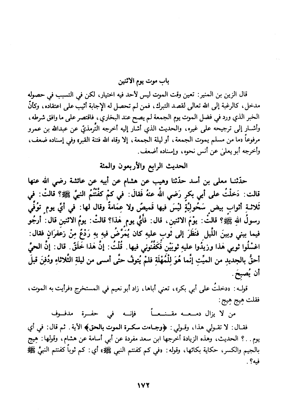 قال الزين بن المنير: تعين وقت الموت ليس لأحد فيه اختيار، لكن في التسبب في حصوله مدخل، كالرغبة إلى الله تعالى لقصد التبرك، فمن لم تحصل له الإجابة أثيب على اعتقاده، وكأنّ الخبر الذي ورد في فضل الموت يوم الجمعة لم يصح عند البخاري، فاقتصر على ما وافق شرطه، وأشار إلى ترجيحه على غيره، والحديث الذي أشار إليه أخرجه التِّرمذيّ عن عبد الله بن عمرو مرفوعًا "ما من مسلم يموت الجمعة، أو ليلة الجمعة، إلا وقاه الله فتنة القبر" وفي إسناده ضعف، وأخرجه أبو يعلى عن أنس نحوه، وإسناده أضعف.