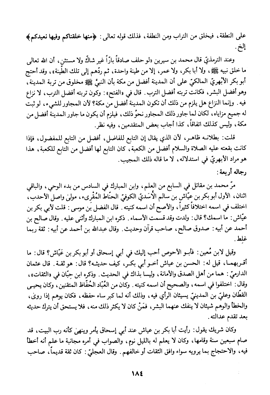 وعند الترمذيّ قال محمد بن سيرين "لو حلف صادقًا بارًّا غير شاكٌ ولا مستثنٍ، أن الله تعالى ما خلق نبيه -صلى الله عليه وسلم-، ولا أبا بكر، ولا عمر، إلا من طينة واحدة، ثم ردّهم إلى تلك الطينة"، وقد أحتج أبو بكر الأبْهريّ المالكيّ على أن المدينة أفضل من مكة بأن النبيّ -صلى الله عليه وسلم- مخلوق من تربة المدينة، وهو أفضل البشر، فكانت تربته أفضل الترب. قال في "الفتح ": وكون تربته أفضل الترب، لا نزاع فيه. وإنما النزاع هل يلزم من ذلك أن تكون المدينة أفضل من مكة؟ لأن المجاور للشيء، لو ثبت له جميع مزاياه، لكان لما جاور ذلك المجاور نحوُ ذلك، فيلزم أن يكون ما جاور المدينة أفضل من مكة، وليس كذلك اتفاقًا، كذا أجاب بعض المتقدمين، وفيه نظر.