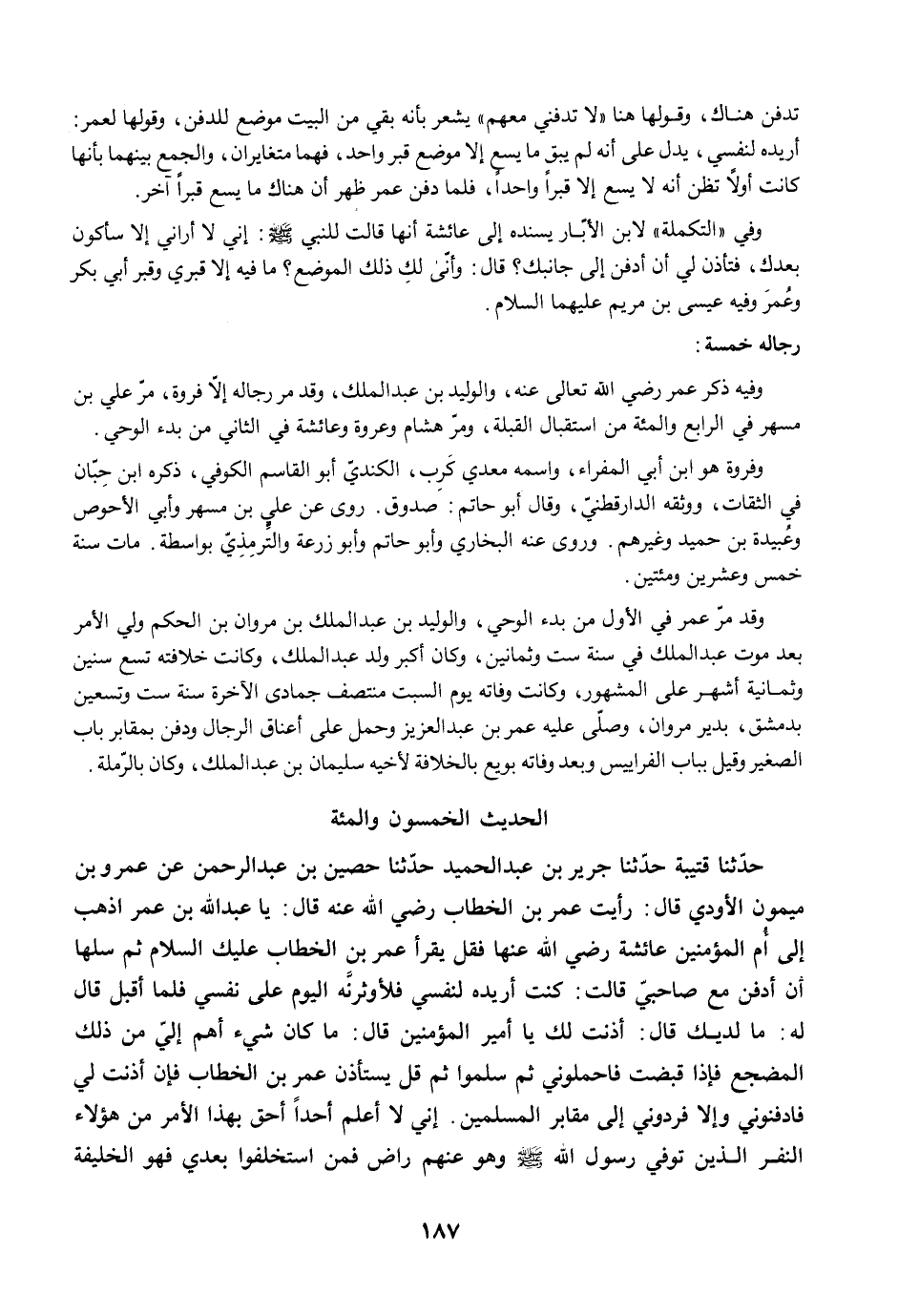 وقد مرَّ عمر في الأول من بدء الوحي، والوليد بن عبد الملك بن مروان بن الحكم ولي الأمر بعد موت عبد الملك في سنة ست وثمانين، وكان أكبر ولد عبد الملك، وكانت خلافته تسع سنين وثمانية أشهر على المشهور، وكانت وفاته يوم السبت منتصف جمادى الآخرة سنة ست وتسعين بدمشق، بدير مروان، وصلّى عليه عمر بن عبد العزيز وحمل على أعناق الرجال ودفن بمقابر باب الصغير وقيل بباب الفراييس وبعد وفاته بويع بالخلافة لأخيه سليمان بن عبد الملك، وكان بالرّملة.