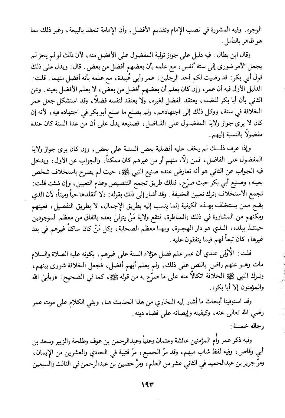 وقال ابن بطال: فيه دليل على جواز تولية المفضول على الأفضل منه؛ لأن ذلك لو لم يجز لم يجعل الأمر شورى إلى ستة أنفس، مع علمه بأن بعضهم أفضل من بعض. قال: ويدل على ذلك قول أبي بكر: قد رضيت لكم أحد الرجلين: عمر وأبي عُبيدة، مع علمه بأنه أفضل منهما. قلت: الدليل الأول فيه أن عمر، وإن كان يعلم أن بعضهم أفضل من بعض، لا يعلم الأفضل بعينه. وعن الثاني بأن أبا بكر لفضله، يعتقد الفضل لغيره، ولا يعتقد لنفسه فضلًا، وقد استشكل جعل عمر الخلافة في ستة، ووكل ذلك إلى اجتهادهم، ولم يصنع ما صنع أبو بكر في اجتهاده فيه؛ لأنه إن كان لا يرى جواز ولاية المفضول على الفاضل، فصنيعه يدل على أن من عدا الستة كان عنده مفضولًا بالنسبة إليهم.