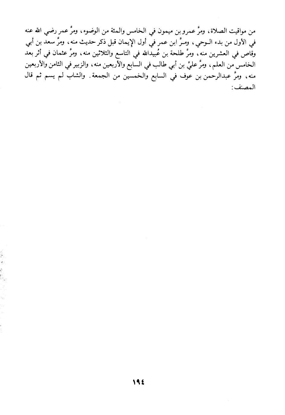 من مواقيت الصلاة، ومرَّ عمرو بن ميمون في الخاص والمئة من الوضوء، ومرَّ عمر رضي الله عنه في الأول من بدء الوحي، ومرَّ ابن عمر في أول الإيمان قبل ذكر حديث منه، ومرَّ سعد بن أبي وقاص في العشرين منه، ومرَّ طلحة بن عُبيد الله في التاسع والثلاثين منه، ومرَّ عثمان في أثر بعد الخامس من العلم، ومرَّ علي بن أبي طالب في السابع والأربعين منه، والزبير في الثامن والأربعين منه، ومرَّ عبد الرحمن بن عوف في السابع والخمسين من الجمعة. والشاب لم يسم ثم قال المصنف: