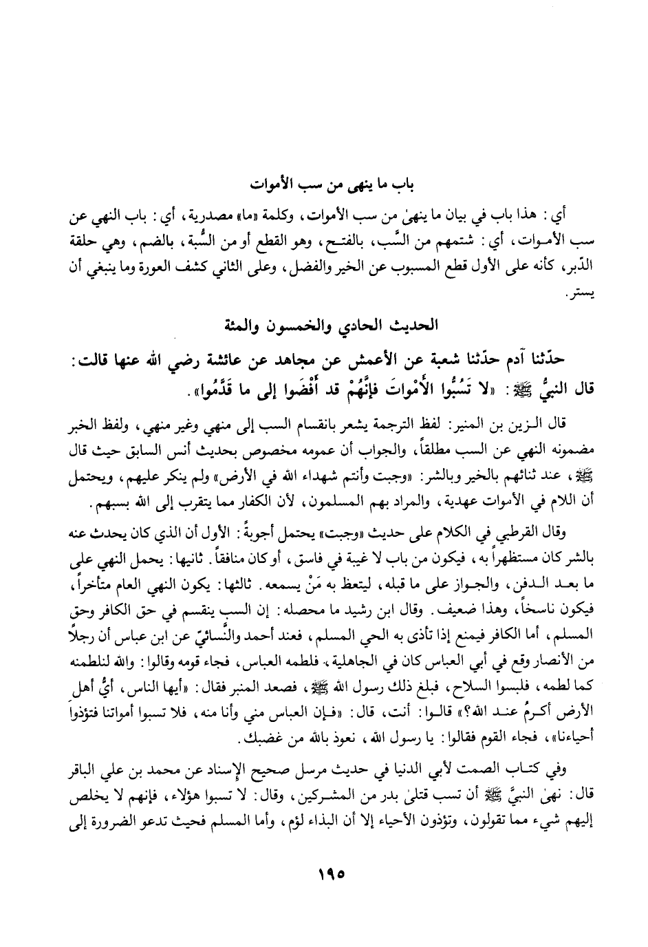 وفي كتاب الصمت لأبي الدنيا في حديث مرسل صحيح الإِسناد عن محمد بن علي الباقر قال: نهى النبيَّ -صلى الله عليه وسلم- أن تسب قتلى بدر من المشركين، وقال: لا تسبوا هؤلاء، فإنهم لا يخلص إليهم شيء مما تقولون، وتؤذون الأحياء إلا أن البذاء لؤم، وأما المسلم فحيث تدعو الضرورة إلى