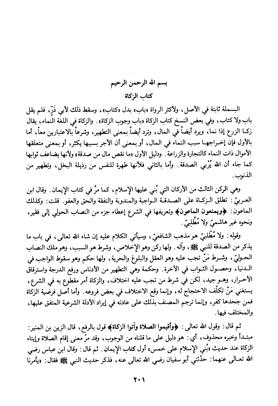 وهي الركن الثالث من الأركان التي بُني عليها الإِسلام، كما مرَّ في كتاب الإيمان. وقال ابن العربي: تطلق الزكاة على الصدقة الواجبة والمندوبة والنفقة والحق والعفو. قلت: وكذلك الماعون: {وَيَمْنَعُونَ الْمَاعُونَ} وتعريفها في الشرع إعطاء جزء من النصاب الحولي إلى فقير، ونحوه غير هاشميّ ولا مُطَّلِبيّ.