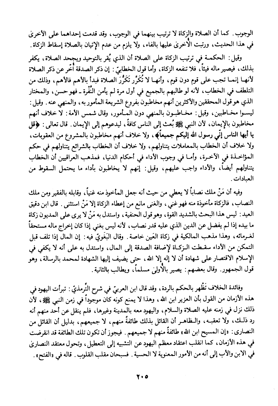 وقيل: الحكمة في ترتيب الزكاة على الصلاة أن الذي يُقر بالتوحيد ويجحد الصلاة، يكفر بذلك، فيصير ماله فيئًا، فلا تنفعه الزكاة، وأما قول الخطابيّ: إن ذكر الصدقة أُخّر عن ذكر الصلاة لأنها إنما تجب على قوم دون قوم، وأنها لا تُكَرَّر تَكَرُّرَ الصلاة فبدأ بالأهم فالأهم، وذلك من التلطف في الخطاب؛ لأنه لو طالبهم بالجميع في أول مرة لم يأمن النَّفْرة - فهو حسن، والمختار الذي هو قول المحققين والأكثرين أنهم مخاطبون بفروع الشريعة المأمور به، والمنهي عنه. وقيل: ليسوا مخاطبين، وقيل: مخاطبون بالمنهي دون المأمور، وقال شمس الأمة: لا خلاف أنهم مخاطبون بالإيمان؛ لأن النبي -صلى الله عليه وسلم- بُعث إلى الناس كافةً، ليدعوهم إلى الإيمان. قال تعالى: {قُلْ يَا أَيُّهَا النَّاسُ إِنِّي رَسُولُ اللَّهِ إِلَيْكُمْ جَمِيعًا}، ولا خلاف أنهم مخاطبون بالمشروع من العقوبات، ولا خلاف أن الخطاب بالمعاملات يتناولهم، ولا خلاف أن الخطاب بالشرائع يتناولهم في حكم المؤاخذة في الآخرة، وأما في وجوب الأداء في أحكام الدنيا، فمذهب العراقيين أن الخطاب يتناولهم أيضًا، والأداء واجب عليهم، وقيل: إنهم لا يخاطبون بأداء ما يحتمل السقوط من العبادات.