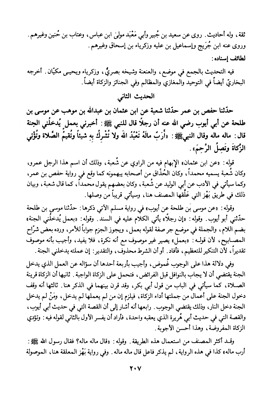 وفي دلالة هذا على الوجوب غُموض، وأجيب بأربعة أحدها أن سؤاله عن العمل الذي يدخل الجنة يقتضي أن لا يجاب بالنوافل قبل الفرائض، فتحمل على الزكاة الواجبة. ثانيها أن الزكاة قرينة الصلاة، كما سيأتي في الباب من قول أبي بكر، وقد قرن بينهما في الذكر هنا. ثالثها أنه وقف دخول الجنة على أعمال من جملتها أداء الزكاة، فيلزم إن من لم يعملها لم يدخل، ومَنْ لم يدخل الجنة دخل النار، وذلك يقتضي الوجوب. رابعها أنه أشار إلى أن القصة التي في حديث أبي أيوب، والقصة التي في حديث أبي هُريرة الذي يعقبه واحدة، فأراد أن يفسر الأول بالثاني لقوله فيه: وتؤدي الزكاة المفروضة، وهذا أحسن الأجوبة.