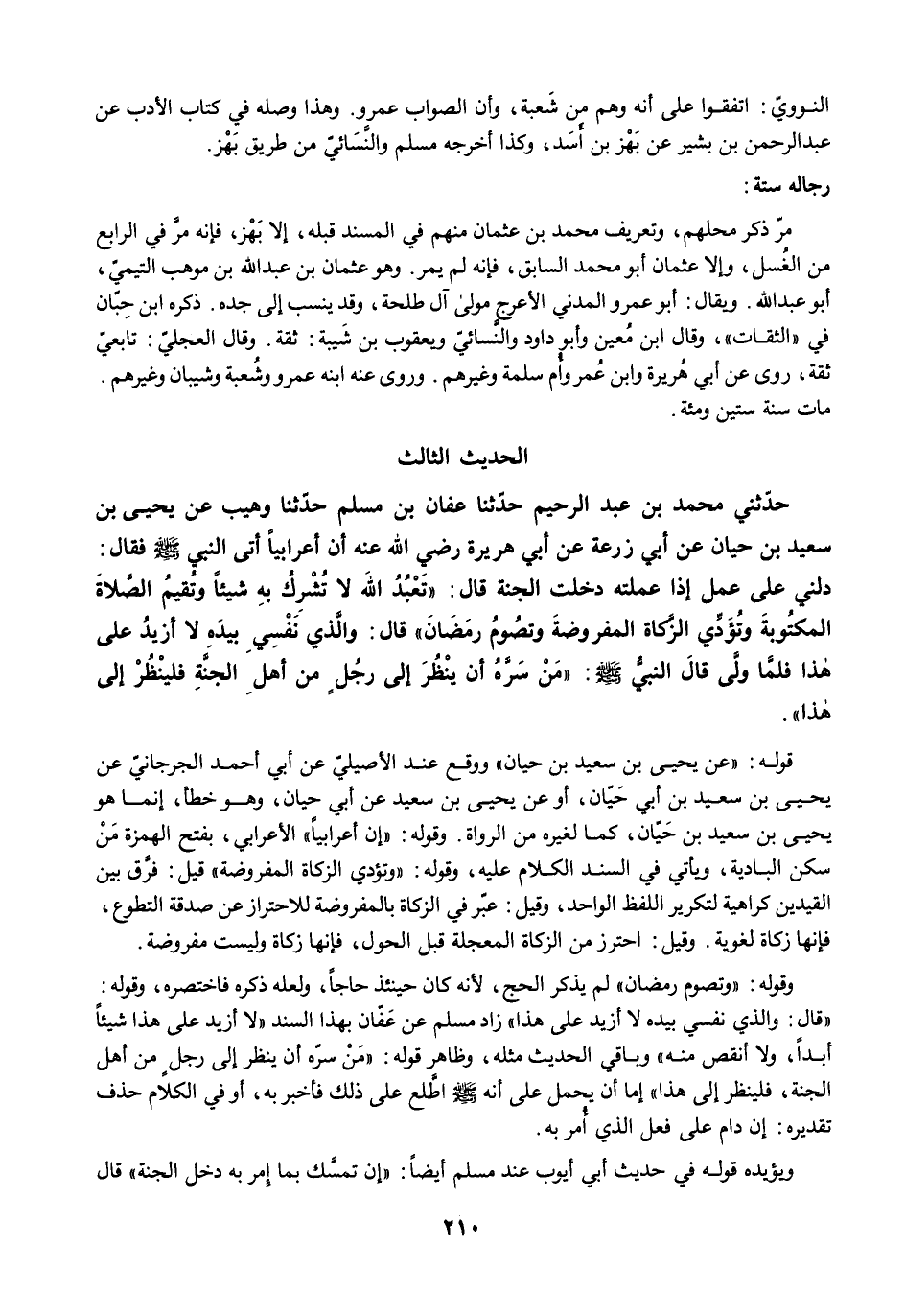 حَدَّثَنِي مُحَمَّدُ بْنُ عَبْدِ الرَّحِيمِ حَدَّثَنَا عَفَّانُ بْنُ مُسْلِمٍ حَدَّثَنَا وُهَيْبٌ عَنْ يَحْيَى بْنِ سَعِيدِ بْنِ حَيَّانَ عَنْ أَبِي زُرْعَةَ عَنْ أَبِي هُرَيْرَةَ رضي الله عنه أَنَّ أَعْرَابِيًّا أَتَى النَّبِيَّ -صلى الله عليه وسلم- فَقَالَ: دُلَّنِي عَلَى عَمَلٍ إِذَا عَمِلْتُهُ دَخَلْتُ الْجَنَّةَ. قَالَ: "تَعْبُدُ اللَّهَ لاَ تُشْرِكُ بِهِ شَيْئًا، وَتُقِيمُ الصَّلاَةَ الْمَكْتُوبَةَ، وَتُؤَدِّي الزَّكَاةَ الْمَفْرُوضَةَ، وَتَصُومُ رَمَضَانَ". قَالَ: وَالَّذِي نَفْسِي بِيَدِهِ لاَ أَزِيدُ عَلَى هَذَا. فَلَمَّا وَلَّى قَالَ النَّبِيُّ -صلى الله عليه وسلم-: "مَنْ سَرَّهُ أَنْ يَنْظُرَ إِلَى رَجُلٍ مِنْ أَهْلِ الْجَنَّةِ فَلْيَنْظُرْ إِلَى هَذَا".
