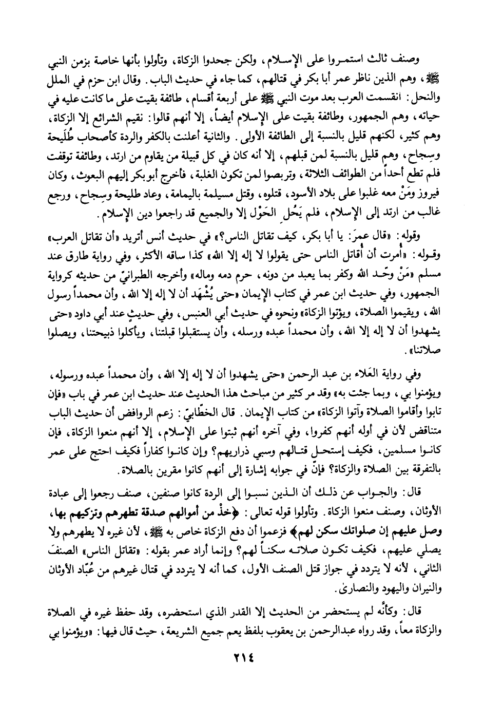 وصنف ثالث استمروا على الإِسلام، ولكن جحدوا الزكاة، وتأولوا بأنها خاصة بزمن النبي -صلى الله عليه وسلم-، وهم الذين ناظر عمر أبا بكر في قتالهم، كما جاء في حديث الباب. وقال ابن حزم في الملل والنحل: انقسمت العرب بعد موت النبي -صلى الله عليه وسلم- على أربعة أقسام، طائفة بقيت على ما كانت عليه في حياته، وهم الجمهور، وطائفة بقيت على الإِسلام أيضًا، إلا أنهم قالوا: نقيم الشرائع إلا الزكاة، وهم كثير، لكنهم قليل بالنسبة إلى الطائفة الأولى. والثانية أعلنت بالكفر والردة كأصحاب طُلَيحة وسِجاح، وهم قليل بالنسبة لمن قبلهم، إلا أنه كان في كل قبيلة من يقاوم من ارتد، وطائفة توقفت فلم تطع أحدا من الطوائف الثلاثة، وتربصوا لمن تكون الغلبة، فأخرج أبو بكر إليهم البعوث، وكان فيروز ومَنْ معه غلبوا على بلاد الأسود، قتلوه، وقتل مسيلمة باليمامة، وعاد طليحة وسِجاح، ورجع غالب من ارتد إلى الإِسلام، فلم يَحُلِ الحَوْل إلا والجميع قد راجعوا دين الإِسلام.