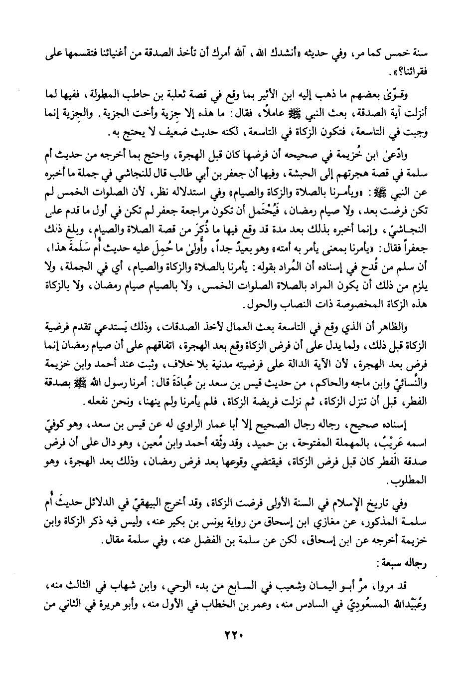 وفي تاريخ الإِسلام في السنة الأولى فرضت الزكاة، وقد أخرج البيهقيّ في الدلائل حديثَ أُم سلمة المذكور، عن مغازي ابن إسحاق من رواية يونس بن بكير عنه، وليس فيه ذكر الزكاة وابن خزيمة أخرجه عن ابن إسحاق، لكن عن سلمة بن الفضل عنه، وفي سلمة مقال.