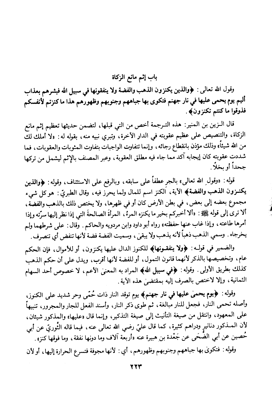 وقول الله تعالى: {وَالَّذِينَ يَكْنِزُونَ الذَّهَبَ وَالْفِضَّةَ وَلَا يُنْفِقُونَهَا فِي سَبِيلِ اللَّهِ فَبَشِّرْهُمْ بِعَذَابٍ أَلِيمٍ (34) يَوْمَ يُحْمَى عَلَيْهَا فِي نَارِ جَهَنَّمَ فَتُكْوَى بِهَا جِبَاهُهُمْ وَجُنُوبُهُمْ وَظُهُورُهُمْ هَذَا مَا كَنَزْتُمْ لِأَنْفُسِكُمْ فَذُوقُوا مَا كُنْتُمْ تَكْنِزُونَ}.