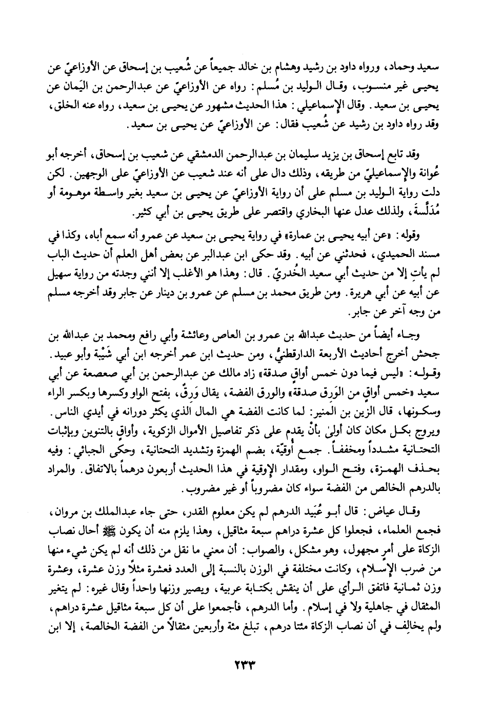 وقال عياض: قال أبو عُبَيد الدرهم لم يكن معلوم القدر، حتى جاء عبد الملك بن مروان، فجمع العلماء، فجعلوا كل عشرة دراهم سبعة مثاقيل، وهذا يلزم منه أن يكون -صلى الله عليه وسلم- أحال نصاب الزكاة على أمرٍ مجهول، وهو مشكل، والصواب: أن معني ما نقل من ذلك أنه لم يكن شيء منها من ضرب الإِسلام، وكانت مختلفة في الوزن بالنسبة إلى العدد فعشرة مثلًا وزن عشرة، وعشرة وزن ثمانية فاتفق الرأي على أن ينقش بكتابة عربية، ويصير وزنها واحدًا وقال غيره: لم يتغير المثقال في جاهلية ولا في إسلام. وأما الدرهم، فاجمعوا على أن كل سبعة مثاقيل عشرة دراهم، ولم يخالِف في أن نصاب الزكاة مئتا درهم، تبلغ مئة وأربعين مثقالًا من الفضة الخالصة، إلا ابن