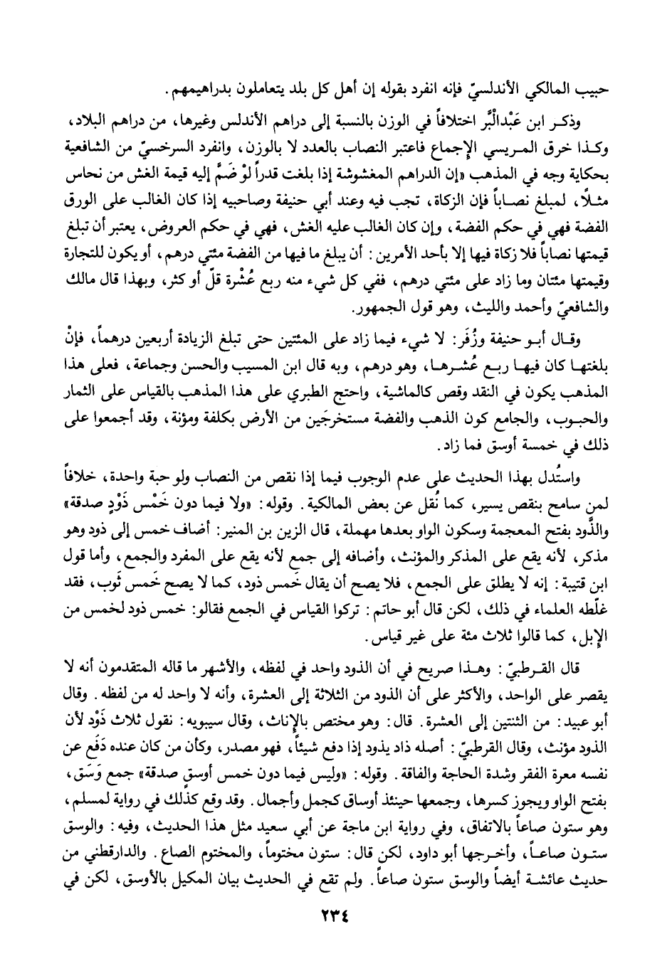 وقال أبو حنيفة وزُفَر: لا شيء فيما زاد على المئتين حتى تبلغ الزيادة أربعين درهمًا، فإنْ بلغتها كان فيها ربع عُشرها، وهو درهم، وبه قال ابن المسيب والحسن وجماعة، فعلى هذا المذهب يكون في النقد وقص كالماشية، واحتج الطبري على هذا المذهب بالقياس على الثمار والحبوب، والجامع كون الذهب والفضة مستخرجَين من الأرض بكلفة ومؤنة، وقد أجمعوا على ذلك في خمسة أوسق فما زاد.