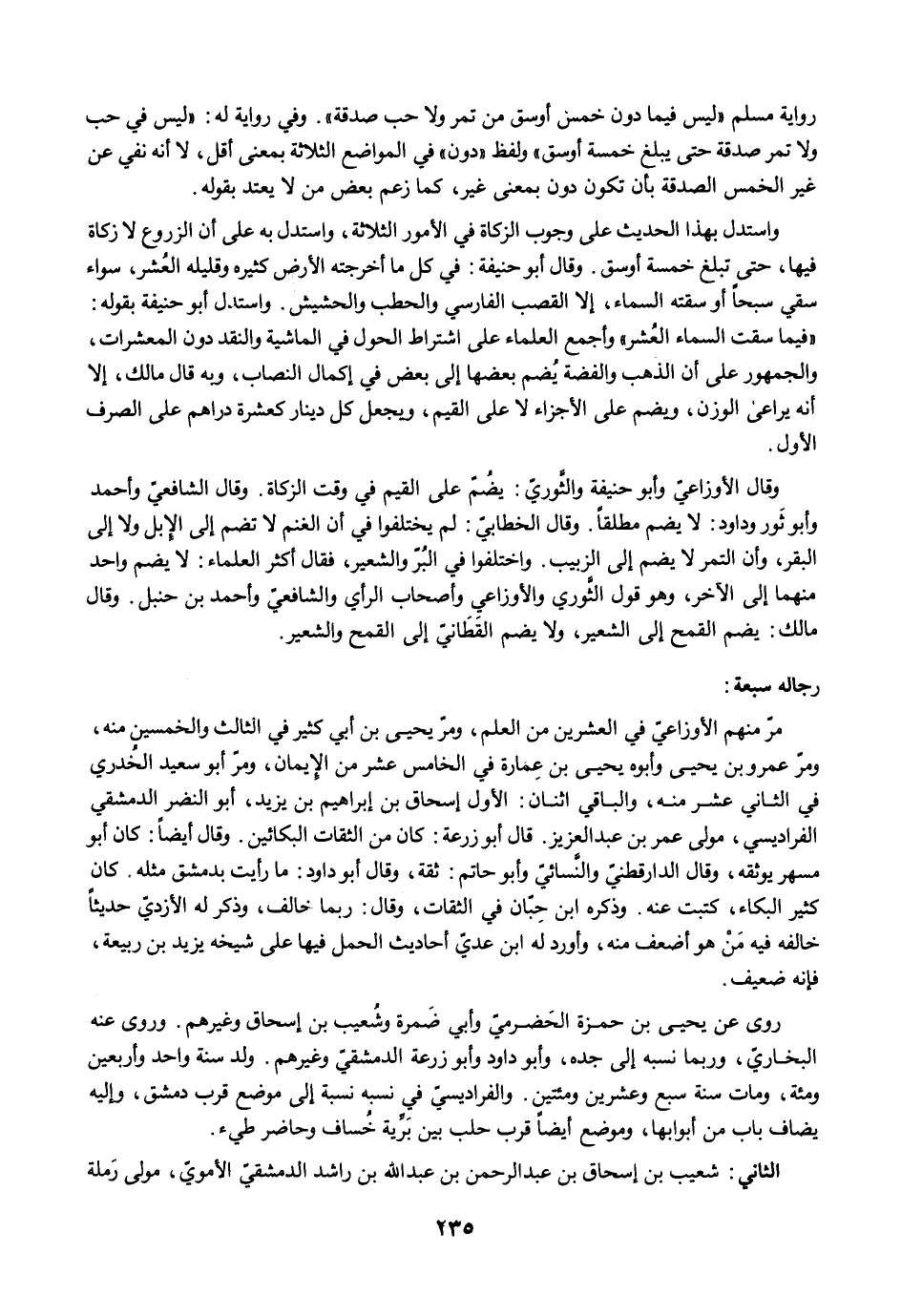 مرّ منهم الأوزاعيّ في العشرين من العلم، ومرّ يحيى بن أبي كثير في الثالث والخمسين منه، ومرَّ عمرو بن يحيى وأبوه يحيى بن عِمارة في الخامس عشر من الإيمان، ومرَّ أبو سعيد الخُدري في الثاني عشر منه، والباقي اثنان: الأول إسحاق بن إبراهيم بن يزيد، أبو النضر الدمشقي الفراديسي، مولى عمر بن عبد العزيز. قال أبو زرعة: كان من الثقات البكائين. وقال أيضًا: كان أبو مسهر يوثقه، وقال الدارقطنيّ والنَّسائيّ وأبو حاتم: ثقة، وقال أبو داود: ما رأيت بدمشق مثله. كان كثير البكاء، كتبت عنه. وذكره ابن حِبّان في الثقات، وقال: ربما خالف، وذكر له الأزديّ حديثًا خالفه فيه مَنْ هو أضعف منه، وأورد له ابن عديّ أحاديث العمل فيها على شيخه يزيد بن ربيعة، فإنه ضعيف.
