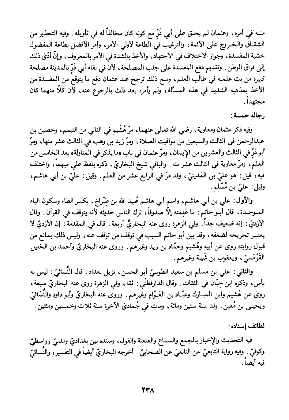 وفيه ذكر عثمان ومعاوية، رضي الله تعالى عنهما، مرَّ هُشَيم في الثاني من التيمم، وحصين بن عبد الرحمن في الثالث والسبعين من مواقيت الصلاة، ومرّ زيد بن وهب في الثالث عشر منها، ومرّ أبو ذَرٍّ في الثالث والعشرين من الإيمان، ومرَّ عثمان في باب "ما يذكر في المناولة" بعد الخامس من العلم، ومرَّ معاوية في الثالث عشر منه. والباقي شيخ البخاريّ، ذكره بلفظ علي مبهمًا، واختلف فيه، قيل: هو عليّ بن المَدينيّ، وقد مرَّ في الرابع عشر من العلم. وقيل: عليّ بن أبي هاشم، وقيل: عليّ بن مُسْلِم.