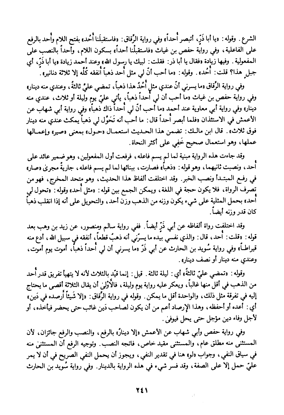 الشرع. وقوله: "يا أبا ذَرٍّ، أتبصر أُحدًا" وفي رواية الرِّقاق: "فاستقبلَنا أُحُد" بفتح اللام وأُحد بالرفع على الفاعلية، وفي رواية حفص بن غياث "فاستقبلْنا أحدًا" بسكون اللام، وأحدًا بالنصب على المفعولية. وفيها زيادة " فقال يا أبا ذر: فقلت: لبيك يا رسول الله" وعند أحمد زيادة "يا أبا ذَرٍّ، أي جبل هذا؟ قلت: أُحُد". وقوله: "ما أحب أنّ لي مثل أُحد ذهبًا أُنفقه كُلَّه إلا ثلاثة دنانير".