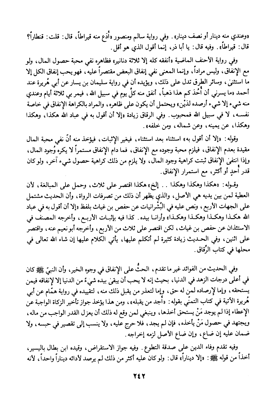 وفي رواية الأحنف الماضية "أنفقه كله إلا ثلاثة دنانير" فظاهره نفي محبة حصول المال، ولو مع الانفاق، وليس مرادًا، وإنما المعنى نفي إنفاق البعض مقتصرًا عليه، فهو يحب إنفاق الكل إلا ما استثنى، وسائر الطرق تدل على ذلك، ويؤيده أن في رواية سليمان بن يسار عن أبي هُريرة عند أحمد "ما يسرني أن أُحُدَ كم هذا ذهبًا، أنفق منه كلَّ يوم في سبيل الله، فيمر بي ثلاثة أيام وعندي منه شيء إلا شيء أرصده لدَيْن" ويحتمل أن يكون على ظاهره، والمراد بالكراهة الإنفاق في خاصة نفسه، لا في سبيل الله فمحبوب. وفي الرقاق زيادة "إلا أن أقول به في عباد الله هكذا، وهكذا وهكذا، عن يمينه، وعن شماله، ومن خلفه".