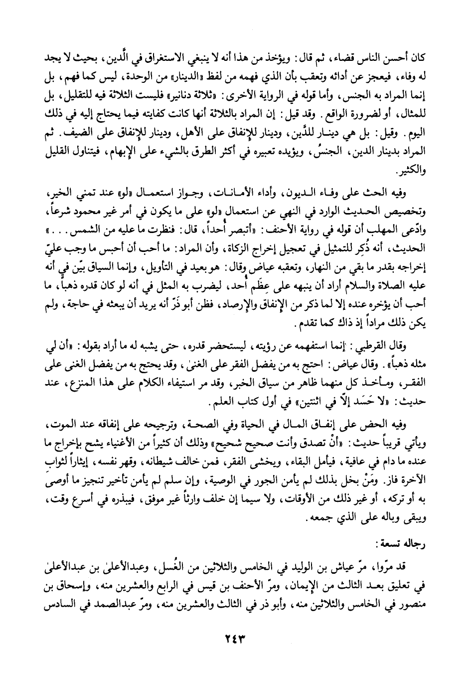 كان أحسن الناس قضاء، ثم قال: ويؤخذ من هذا أنه لا ينبغي الاستغراق في الدَّين، بحيث لا يجد له وفاء، فيعجز عن أدائه وتعقب بأن الذي فهمه من لفظ "الدينار" من الوحدة، ليس كما فهم، بل إنما المراد به الجنس، وأما قوله في الرواية الأخرى: "ثلاثة دنانير" فليست الثلاثة فيه للتقليل، بل للمثال، أو لضرورة الواقع. وقد قيل: إن المراد بالثلاثة أنها كانت كفايته فيما يحتاج إليه في ذلك اليوم. وقيل: بل هي دينار للدَّين، ودينار للإنفاق على الأهل، ودينار للإنفاق على الضيف. ثم المراد بدينار الدين، الجنسُ، ويؤيده تعبيره في أكثر الطرق بالشيء على الإبهام، فيتناول القليل والكثير.