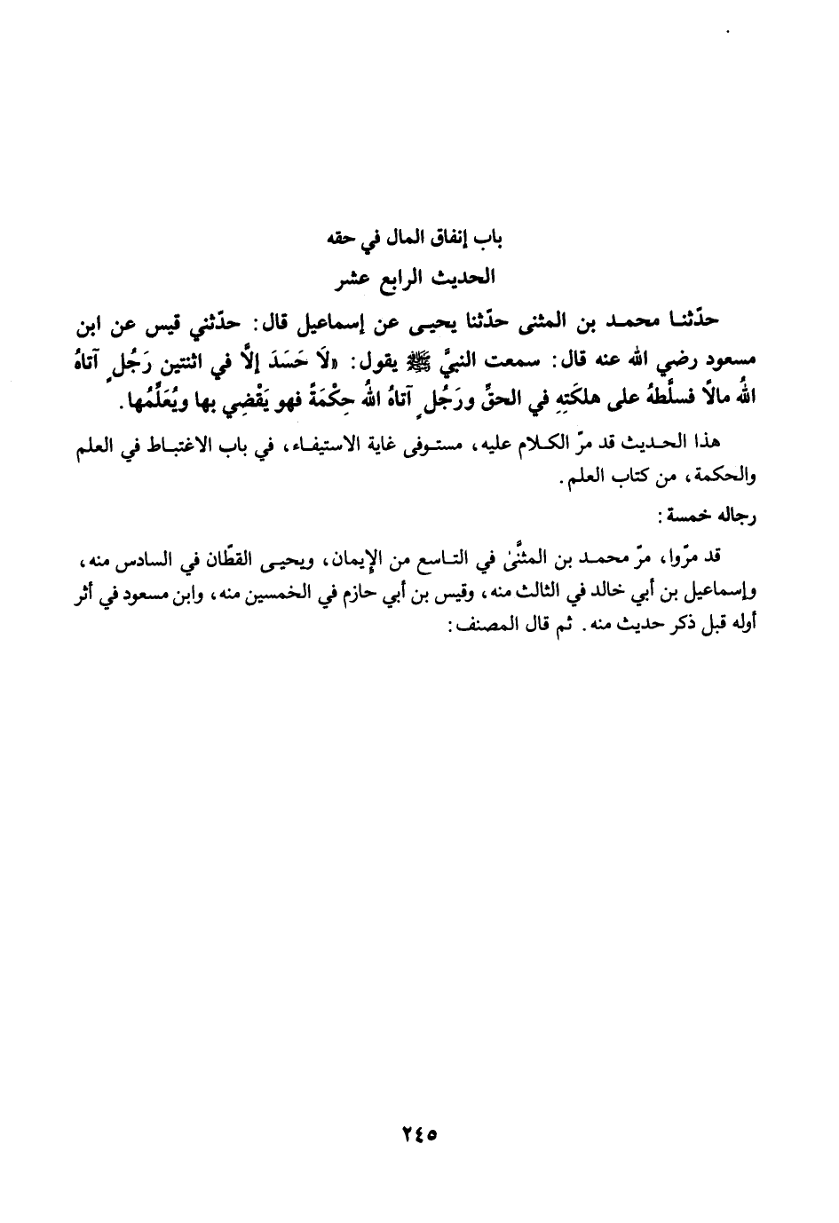 حَدَّثَنَا مُحَمَّدُ بْنُ الْمُثَنَّى حَدَّثَنَا يَحْيَى عَنْ إِسْمَاعِيلَ قَالَ: حَدَّثَنِي قَيْسٌ عَنِ ابْنِ مَسْعُودٍ رضي الله عنه قَالَ: سَمِعْتُ النَّبِيَّ -صلى الله عليه وسلم- يَقُولُ: "لاَ حَسَدَ إِلاَّ فِي اثْنَتَيْنِ رَجُلٌ آتَاهُ اللَّهُ مَالاً فَسَلَّطَهُ عَلَى هَلَكَتِهِ فِي الْحَقِّ، وَرَجُلٌ آتَاهُ اللَّهُ حِكْمَةً فَهْوَ يَقْضِي بِهَا وَيُعَلِّمُهَا".