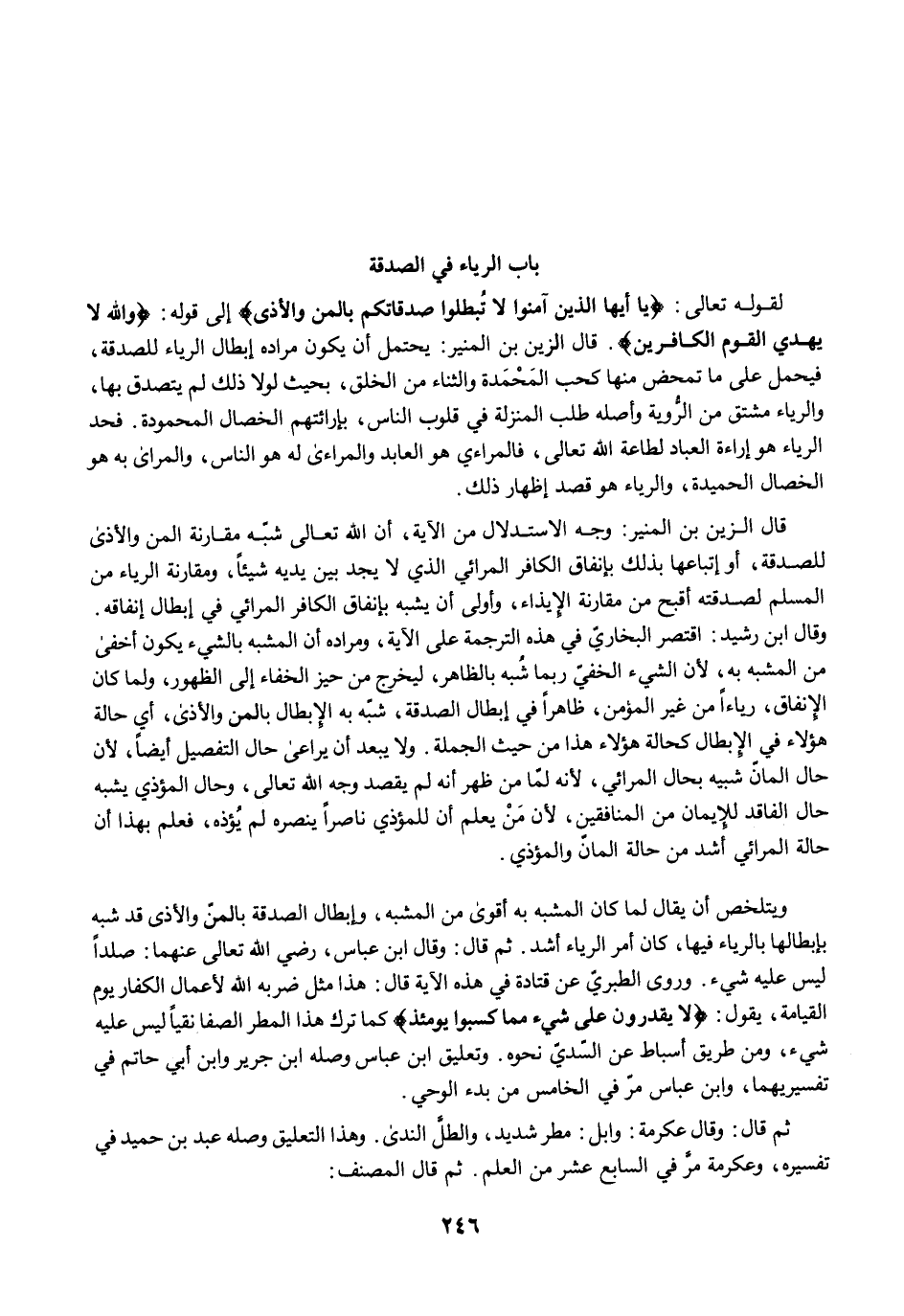 قال الزين بن المنير: وجه الاستدلال من الآية، أن الله تعالى شبّه مقارنة السنن والأذى للصدقة، أو إتباعها بذلك بإنفاق الكافر المرائي الذي لا يجد بين يديه شيئًا، ومقارنة الرياء من المسلم لصدقته أقبح من مقارنة الإيذاء، وأولى أن يشبه بإنفاق الكافر المرائي في إبطال إنفاقه. وقال ابن رشيد: اقتصر البخاريّ في هذه الترجمة على الآية، ومراده أن المشبه بالشيء يكون أخفى من المشبه به؛ لأن الشيء الخفيّ ربما شُبه بالظاهر، ليخرج من حيز الخفاء إلى الظهور، ولما كان الإنفاق، رياءًا من غير المؤمن، ظاهرًا في ابطال الصدقة، شبّه به الإبطال بالمن والأذى، أي حالة هؤلاء في الإبطال كحالة هؤلاء هذا من حيث الجملة. ولا يبعد أن يراعى حال التفصيل أيضًا؛ لأن حال إيمان شبيه بحال المرائي؛ لأنه لمّا من ظهر أنه لم يقصد وجه الله تعالى، وحال المؤذي يشبه حال الفاقد للإيمان من المنافقين؛ لأن مَنْ يعلم أن للمؤذي ناصرًا ينصره لم يُؤذه، فعلم بهذا أن حالة المرائي أشد من حالة المانّ والمؤذي.