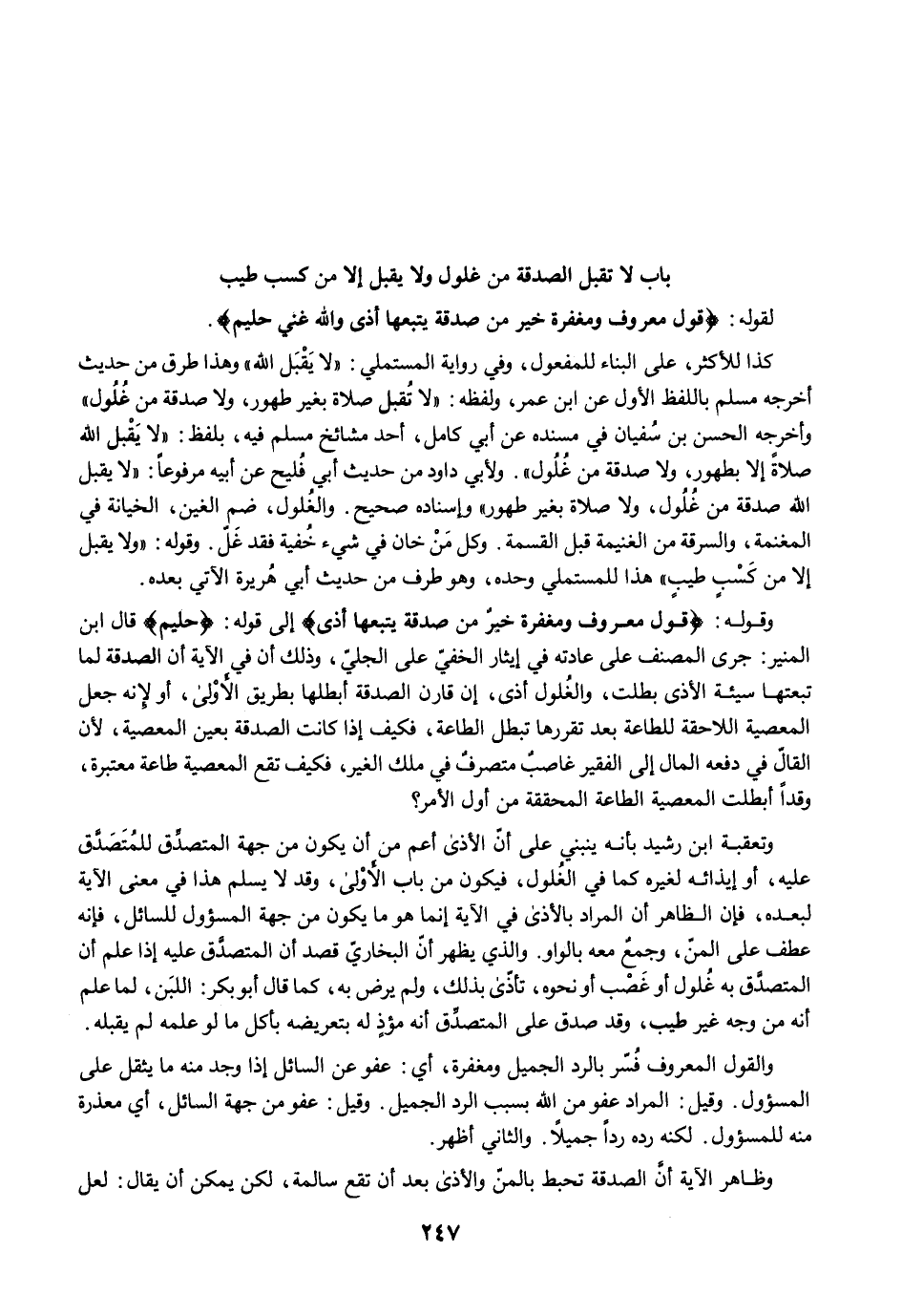 وتعقبة ابن رشيد بأنه ينبني على أنّ الأذى أعم من أن يكون من جهة المتصدِّق للمُتَصَدَّق عليه، أو إيذائه لغيره كما في الغُلول، فيكون من باب الأوْلى، وقد لا يسلم هذا في معنى الآية لبعده، فإن الظاهر أن المراد بالأذى في الآية إنما هو ما يكون من جهة المسؤول للسائل، فإنه عطف على المنّ، وجمعٌ معه بالواو. والذي يظهر أنّ البخاريّ قصد أن المتصدَّق عليه إذا علم أن المتصدَّق به غُلول أو غَصْب أو نحوه، تأذّى بذلك، ولم يرض به، كما قال أبو بكر: اللبَن، لما علم أنه من وجه غير طيب، وقد صدق على المتصدِّق أنه مؤذٍ له بتعريضه بأكل ما لو علمه لم يقبله.