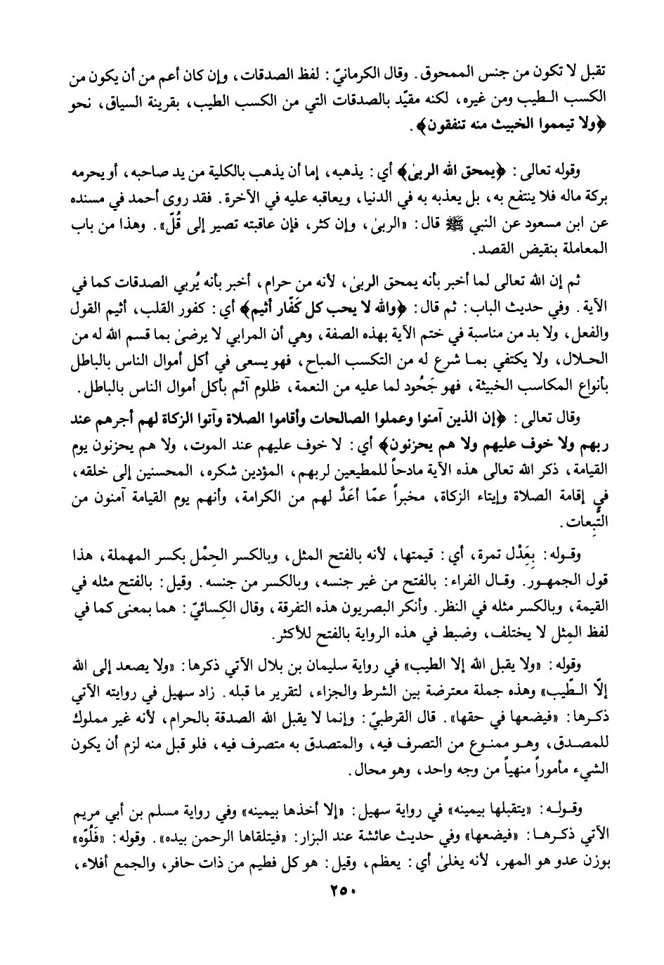 تقبل لا تكون من جنس الممحوق. وقال الكرمانيّ: لفظ الصدقات، وإن كان أعم من أن يكون من الكسب الطيب ومن غيره، لكنه مقيّد بالصدقات التي من الكسب الطيب، بقرينة السياق، نحو {وَلَا تَيَمَّمُوا الْخَبِيثَ مِنْهُ تُنْفِقُونَ}.
