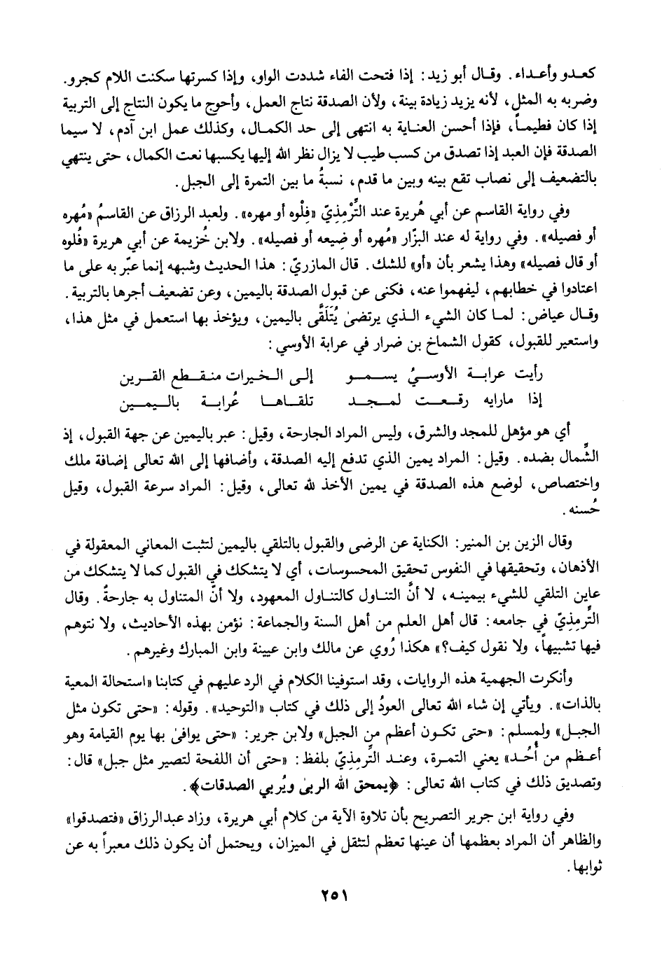 وأنكرت الجهمية هذه الروايات، وقد استوفينا الكلام في الرد عليهم في كتابنا "استحالة المعية بالذات". ويأتي إن شاء الله تعالى العودُ إلى ذلك في كتاب "التوحيد". وقوله: "حتى تكون مثل الجبل" ولمسلم: "حتى تكون أعظم من الجبل" ولابن جرير: "حتى يوافى بها يوم القيامة وهو أعظم من أُحُد" يعني التمرة، وعند التِّرمِذِيّ بلفظ: "حتى أن اللفحة لتصير مثل جبل" قال: وتصديق ذلك في كتاب الله تعالى: {يَمْحَقُ اللَّهُ الرِّبَا وَيُرْبِي الصَّدَقَاتِ}.