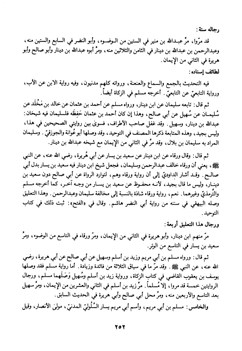 ثم قال: ورواه مسلم بن أبي مريم وزيد بن أسلم وسهيل عن أبي صالح عن أبي هريرة، رضي الله عنه، عن النبي -صلى الله عليه وسلم-. وقد مرّ ما في سياق الثلاثة من فائدة وزيادة. أما رواية مسلم فقد وصلها يوسف بن يعقوب القاضي في كتاب الزكاة، ورواية زيد بن أسلم وسُهيل وَصَلَهما مسلم، ورجال الروايتين خمسة قد مرّوا، إلا مُسلمًا. مرَّ زيد بن أسلم في الثاني والعشرين من الإيمان، ومرَّ سهيل بعد التاسع والأربعين منه، ومرَّ محل أبي صالح وأبي هريرة في الحديث السابق.