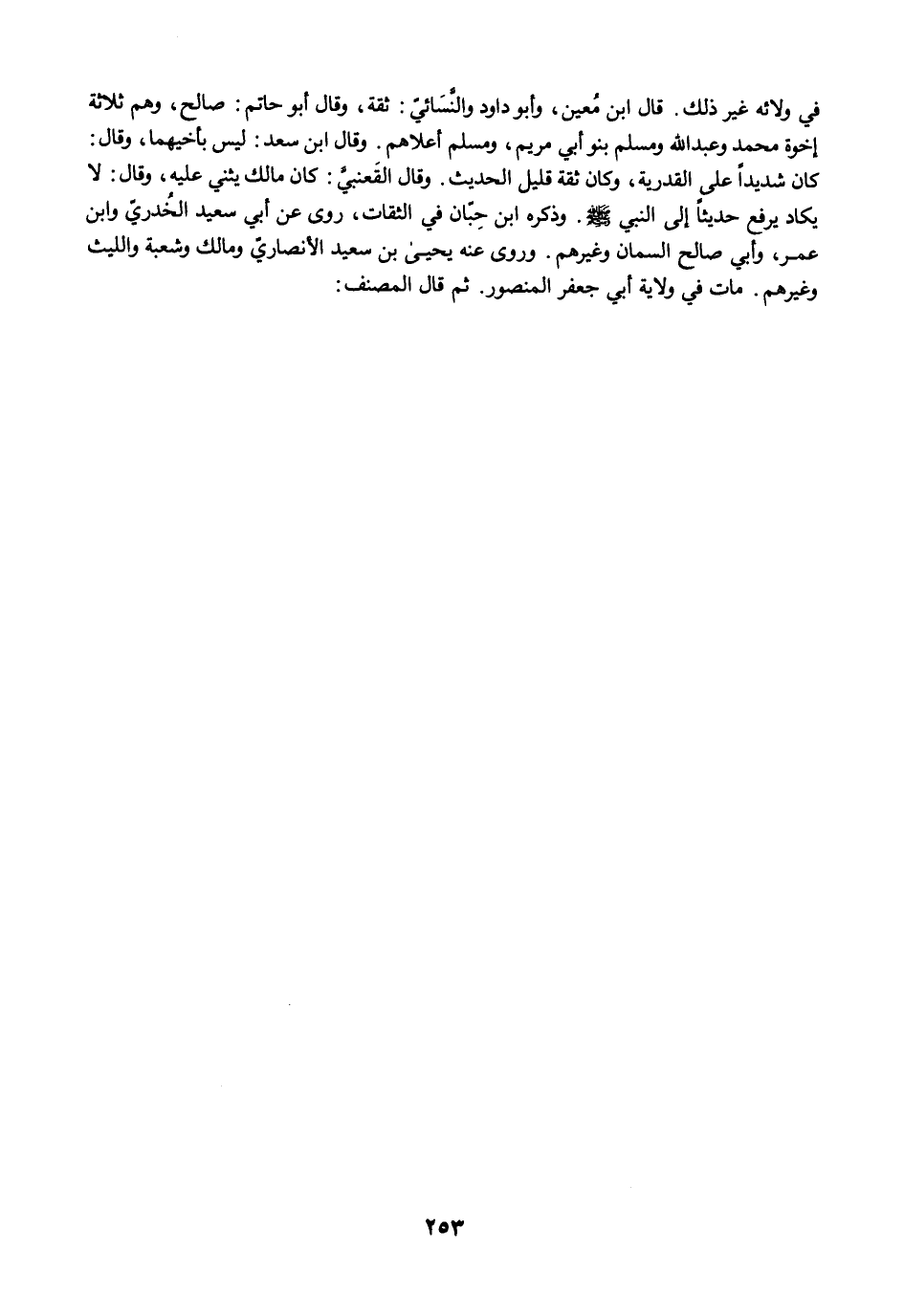 في ولائه غير ذلك. قال ابن مُعين، وأبو داود والنَّسَائيّ: ثقة، وقال أبو حاتم: صالح، وهم ثلاثة إخوة محمد وعبد الله ومسلم بنو أبي مريم، ومسلم أعلاهم. وقال ابن سعد: ليس بأخيهما، وقال: كان شديدًا على القدرية، وكان ثقة قليل الحديث. وقال القَعنبيَّ: كان مالك يثني عليه، وقال: لا يكاد يرفع حديثًا إلي النبي -صلى الله عليه وسلم-. وذكره ابن حِبّان في الثقات، روى عن أبي سعيد الخُدريّ وابن عمر، وأبي صالح السمان وغيرهم. وروى عنه يحيى بن سعيد الأنصاريّ ومالك وشعبة والليث وغيرهم. مات في ولاية أبي جعفر المنصور. ثم قال المصنف: