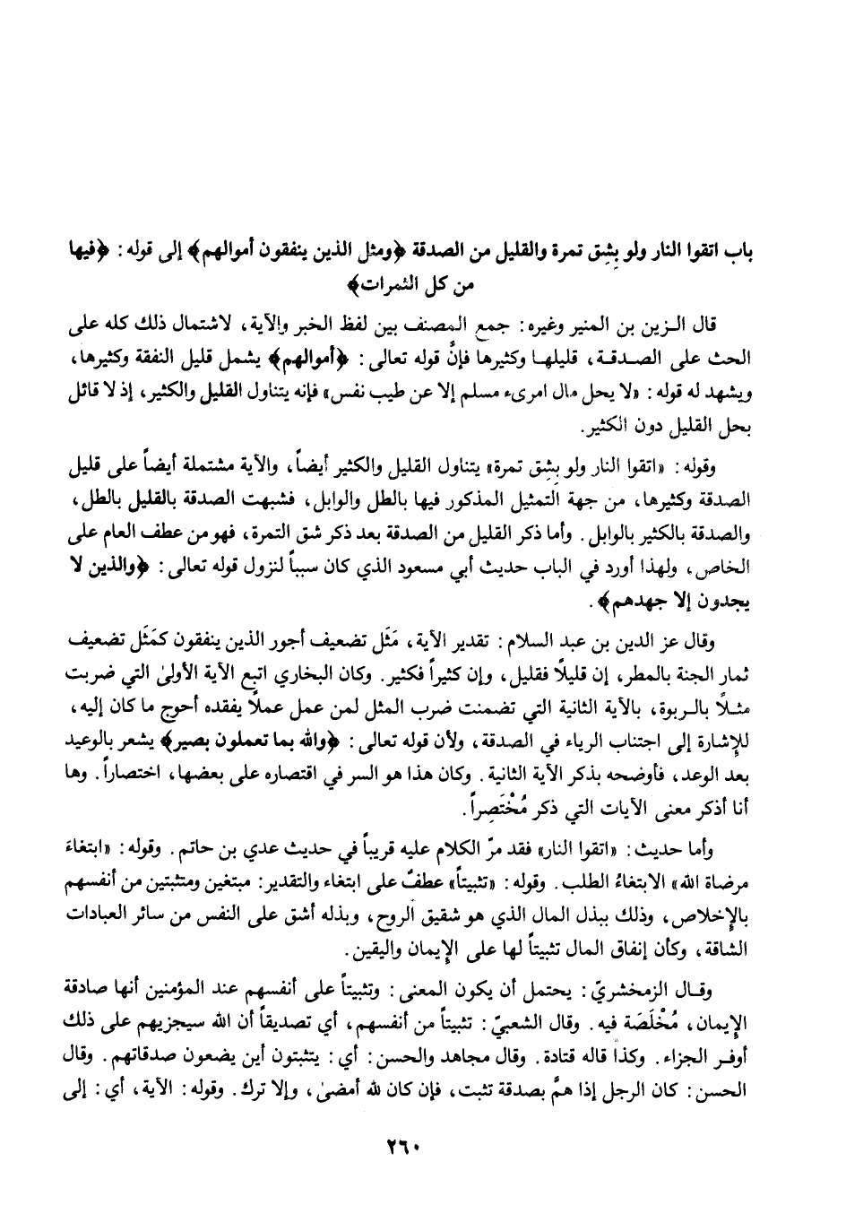 وقال عز الدين بن عبد السلام: تقدير الآية، مَثَل تضعيف أجور الذين ينفقون كمَثَل تضعيف ثمار الجنة بالمطر، إن قليلًا فقليل، وإن كثيرًا فكثير. وكان البخاري اتبع الآية الأولى التي ضربت مثلًا بالربوة، بالآية الثانية التي تضمنت ضرب المثل لمن عمل عملاً يفقده أحوج ما كان إليه، للإشارة إلى اجتناب الرياء في الصدقة، ولأن قوله تعالى: {وَاللَّهُ بِمَا تَعْمَلُونَ بَصِيرٌ} يشعر بالوعيد بعد الوعد، فأوضحه بذكر الآية الثانية. وكان هذا هو السر في اقتصاره على بعضها، اختصارًا. وها أنا أذكر معنى الآيات التي ذكر مُخْتَصِرًا.