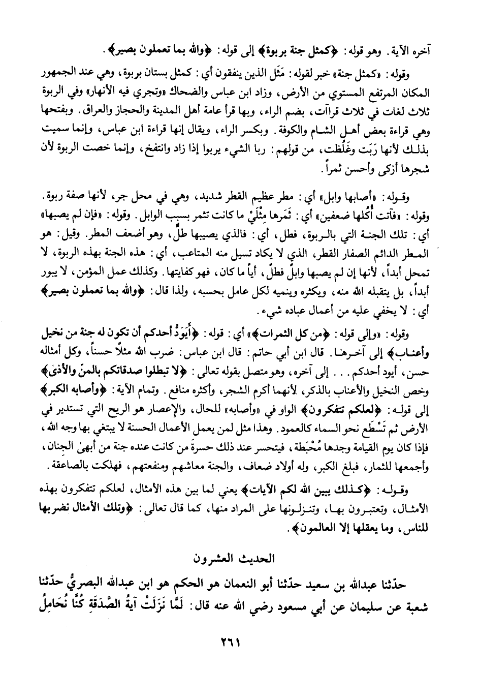 وقوله: "كمثل جنة" خبر لقوله: مَثَل الذين ينفقون أي: كمثل بستان بربوة، وهي عند الجمهور المكان المرتفع المستوي من الأرض، وزاد ابن عباس والضحاك "وتجري فيه الأنهار" وفي الربوة ثلاث لغات في ثلاث قراآت، بضم الراء، وبها قرأ عامة أهل المدينة والحجاز والعراق. وبفتحها وهي قراءة بعض أهل الشام والكوفة. وبكسر الراء، ويقال إنها قراءة ابن عباس، وإنما سميت بذلك لأنها رَبَت وغَلُظت، من قولهم: ربا الشيء يربوا إذا زاد وانتفخ، وإنما خصت الربوة لأن شجرها أزكى وأحسن ثمرًا.