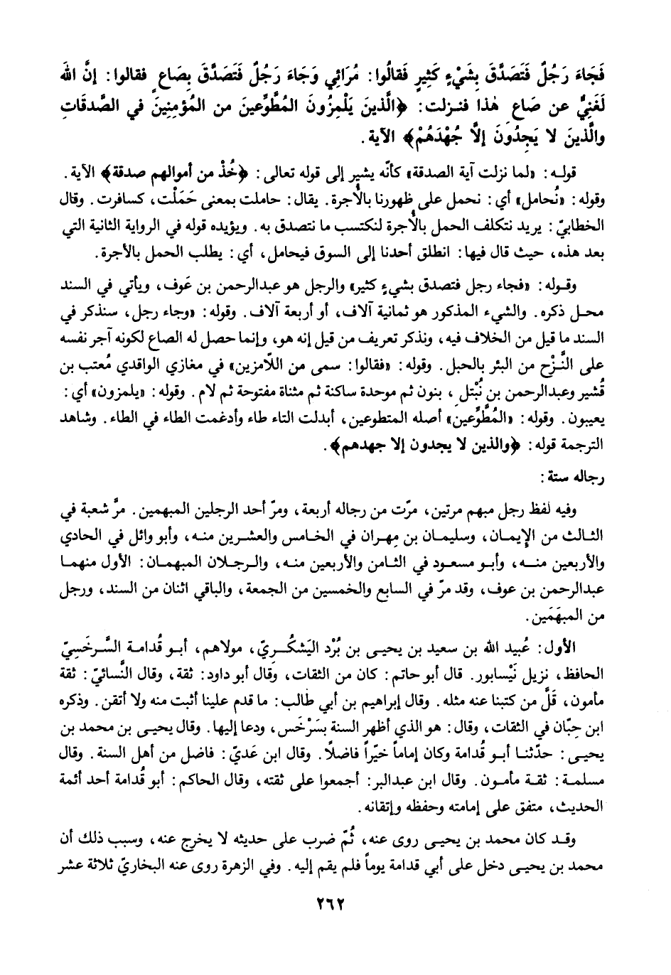 وقوله: "فجاء رجل فتصدق بشيءٍ كثير" والرجل هو عبد الرحمن بن عَوف، ويأتي في السند محل ذكره. والشيء المذكور هو ثمانية آلاف، أو أربعة آلاف. وقوله: "وجاء رجل، سنذكر في السند ما قيل من الخلاف فيه، ونذكر تعريف من قيل إنه هو، وإنما حصل له الصالح لكونه آجر نفسه على النَّزْح من البئر بالحبل. وقوله: "فقالوا: سمى من اللّامزين" في مغازي الواقدي مُعتب بن قُشير وعبد الرحمن بن نُبْتل، بنون ثم موحدة ساكنة ثم مثناة مفتوحة ثم لام. وقوله: "يلمزون" أي: يعيبون. وقوله: "المُطَّوِّعينَ" أصله المتطوعين، أبدلت التاء طاء وأدغمت الطاء في الطاء. وشاهد الترجمة قوله: {وَالَّذِينَ لَا يَجِدُونَ إِلَّا جُهْدَهُمْ}.