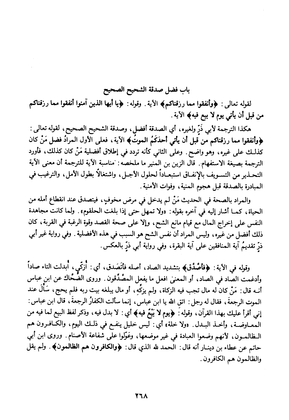 وقوله في الآية: {فَأَصَّدَّقَ} بتشديد الصاد، أصله فأتَصَدق، أي: أُزكّي، أُبدلت التاء صادًا وأدغمت الصاد في الصاد، أو المعنى افعل ما يفعل المصَّدِّقون. وروى الضَّحَّاك عن ابن عباس أنه قال: مَنْ كان له مال تجب فيه الزكاة، ولم يزكِّهِ، أو مال يبلغه بيت ربه فلم يحج، سَأَلَ عند الموت الرجعةَ، فقال له رجل: اتقِ الله يا ابن عباس، إنما سألت الكفارُ الرجعةَ، قال ابن عباس: إني أقرأ عليك بهذا القرآن، وقوله: {يَوْمٌ لَا بَيْعٌ فِيهِ} أي: لا بدل فيه، وذكر لفظ البيع لما فيه من المعاوضة، وأخذ البدل. "ولا خلة" أي: ليس خليل ينفع في ذلك اليوم، والكافرون هم الظالمون؛ لأنهم وضعوا العبادة في غير موضعها، وعَوّلوا على شفاعة الأصنام. وروى ابن أبي حاتم عن عطاء بن دينار أنه قال: الحمد لله الذي قال: {وَالْكَافِرُونَ هُمُ الظَّالِمُونَ}. ولم يقل والظالمون هم الكافرون.