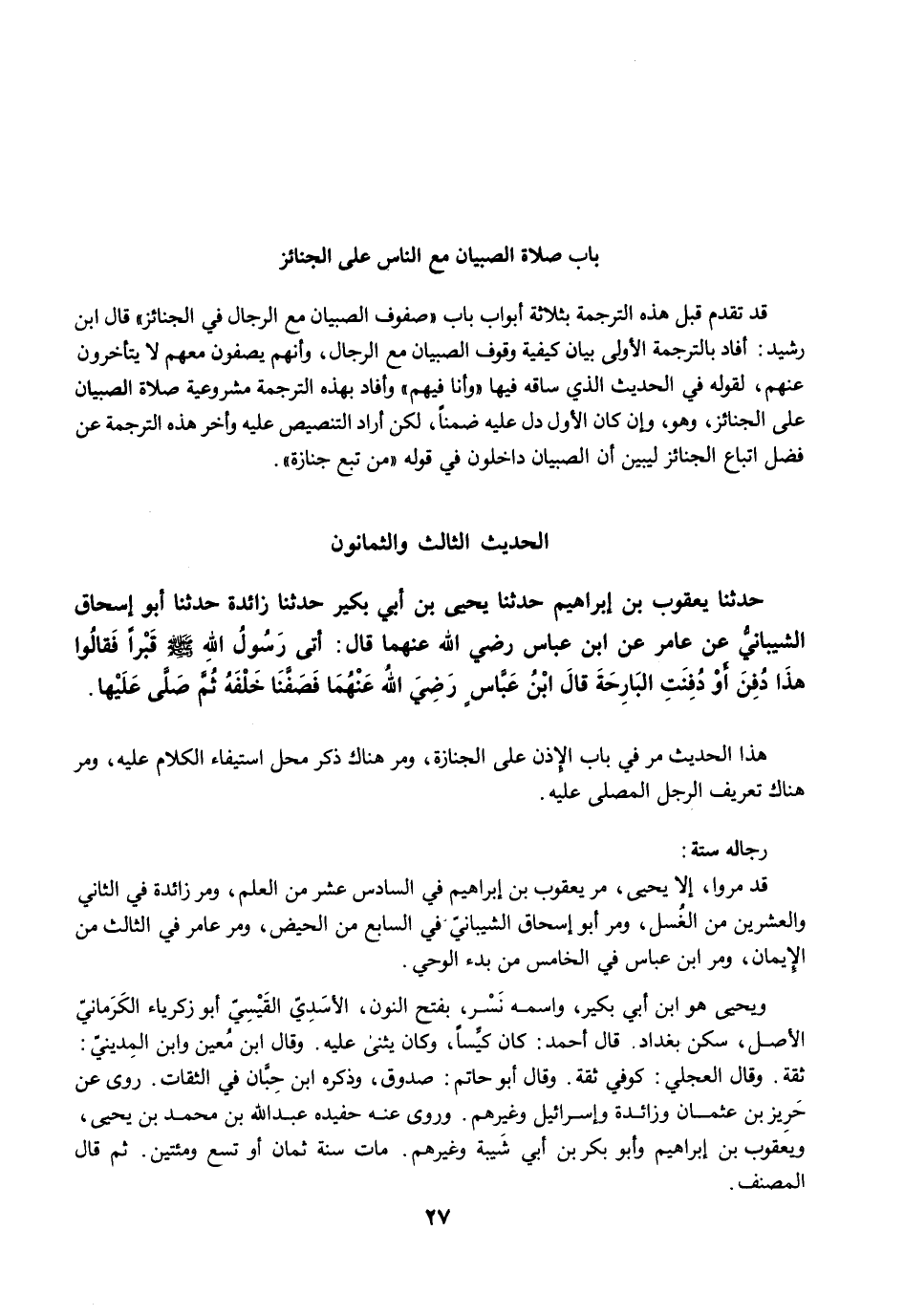 قد مرّوا، إلا يحيى، مرَّ يعقوب بن إبراهيم في السادس عشر من العلم، ومرَّ زائدة في الثاني والعشرين من الغُسل، ومرَّ أبو إسحاق الشيبانيّ في السابع من الحيض، ومرَّ عامر في الثالث من الإِيمان, ومرَّ ابن عباس في الخامس من بدء الوحي.