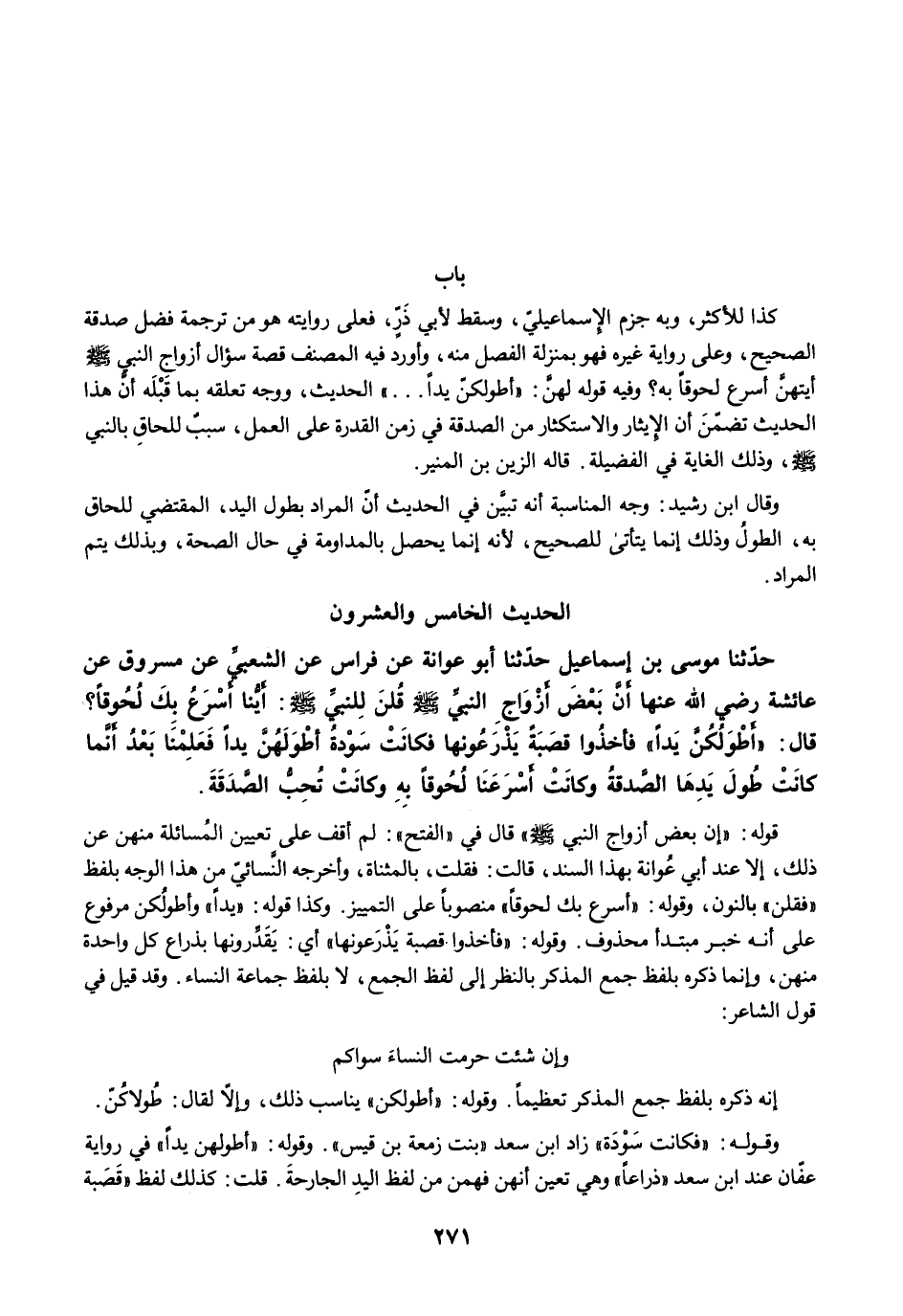 كذا للأكثر، وبه جزم الإسماعيليّ، وسقط لأبي ذَرٍّ، فعلى روايته هو من ترجمة فضل صدقة الصحيح، وعلى رواية غيره فهو بمنزلة الفصل منه، وأورد فيه المصنف قصة سؤال أزواج النبي -صلى الله عليه وسلم- أيتهن أسرع لحوقًا به؟ وفيه قوله لهنَّ: "أطولكنّ يدًا ... " الحديث، ووجه تعلقه بما قَبْلَه أنَّ هذا الحديث تضمّنَ أن الإيثار والاستكثار من الصدقة في زمن القدرة على العمل، سببٌ للحاقِ بالنبي -صلى الله عليه وسلم-، وذلك الغاية في الفضيلة. قاله الزين بن المنير.