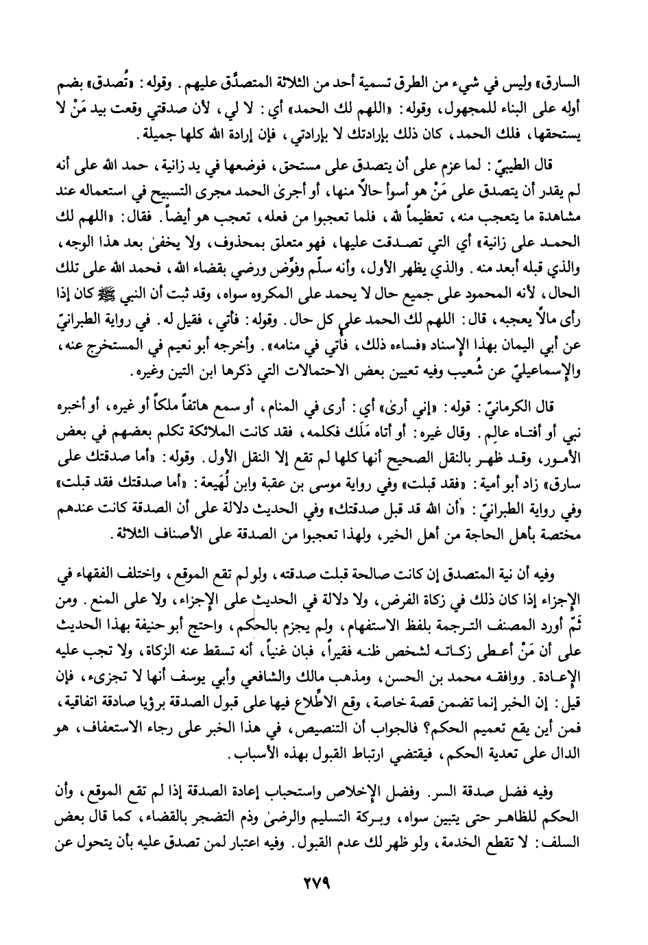 قال الطيبيّ: لما عزم على أن يتصدق على مستحق، فوضعها في يد زانية، حمد الله على أنه لم يقدر أن يتصدق على مَنْ هو أسوأ حالًا منها، أو أجرى الحمد مجرى التسبيح في استعماله عند مشاهدة ما يتعجب منه، تعظيمًا لله، فلما تعجبوا من فعله، تعجب هو أيضًا. فقال: "اللهم لك الحمد على زانية" أي التي تصدقت عليها، فهو متعلق بمحذوف، ولا يخفى بعد هذا الوجه، والذي قبله أبعد منه. والذي يظهر الأول، وأنه سلّم وفوِّض ورضي بقضاء الله، فحمد الله على تلك الحال؛ لأنه المحمود على جميع حال لا يحمد على المكروه سواه، وقد ثبت أن النبي -صلى الله عليه وسلم- كان إذا رأى مالًا يعجبه، قال: اللهم لك الحمد علي كل حال. وقوله: فأتي، فقيل له. في رواية الطبرانيّ عن أبي اليمان بهذا الإسناد "فساءه ذلك، فأتي في منامه". وأخرجه أبو نعيم في المستخرج عنه، والإسماعيليّ عن شُعيب وفيه تعيين بعض الاحتمالات التي ذكرها ابن التين وغيره.