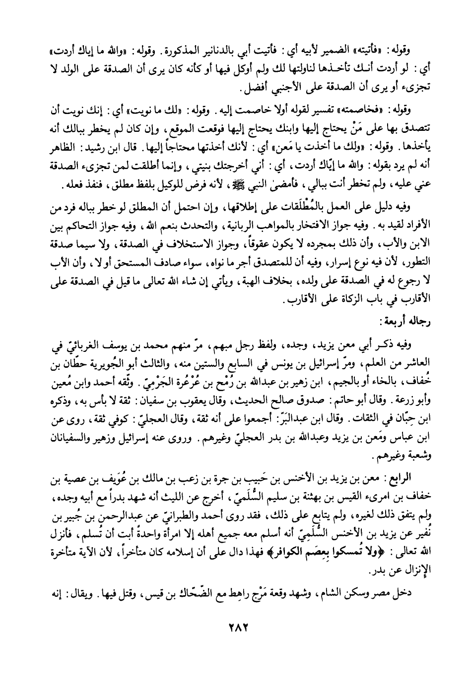 وفيه ذكر أبي معن يزيد، وجده، ولفظ رجل مبهم، مرَّ منهم محمد بن يوسف الغربائيّ في العاشر من العلم، ومرّ إسرائيل بن يونس في السابع والستين منه، والثالث أبو الجُويرية حطّان بن خُفاف، بالخاء أو بالجيم، ابن زهير بن عبد الله بن رُمْح بن عُرْعُرة الجَرْمِيّ، وثقه أحمد وابن مُعين وأبو زرعة. وقال أبو حاتم: صدوق صالح الحديث، وقال يعقوب بن سفيان: ثقة لا بأس به، وذكره ابن حِبّان في الثقات. وقال ابن عبد البَرّ: أجمعوا على أنه ثقة، وقال العجليّ: كوفي ثقة، روى عن ابن عباس ومَعن بن يزيد وعبد الله بن بدر العجليّ وغيرهم. وروى عنه إسرائيل وزهير والسفيانان وشعبة وغيرهم.